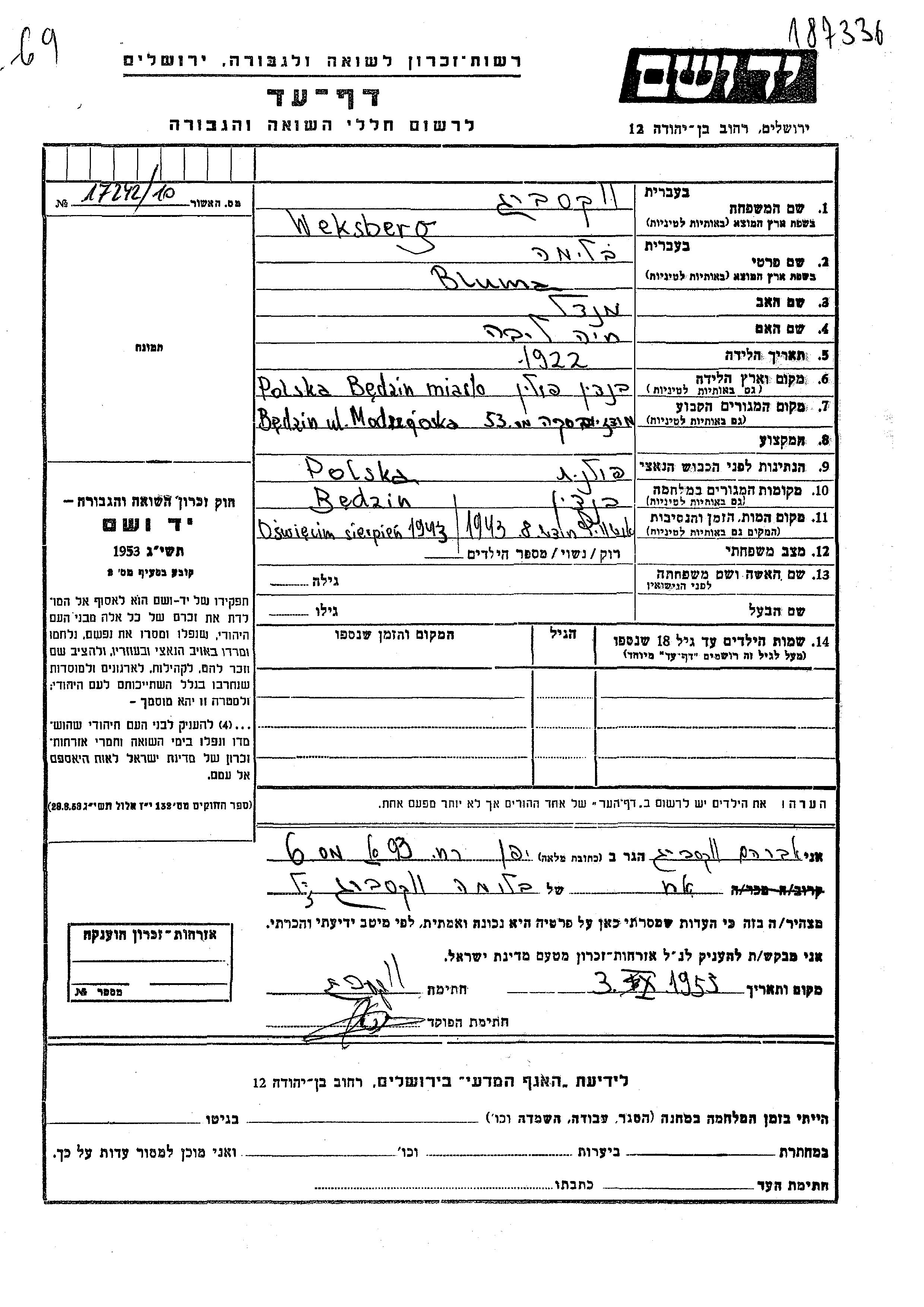 Weksberg Blima 1922 Będzin, Pologne Feuille de témoignage
