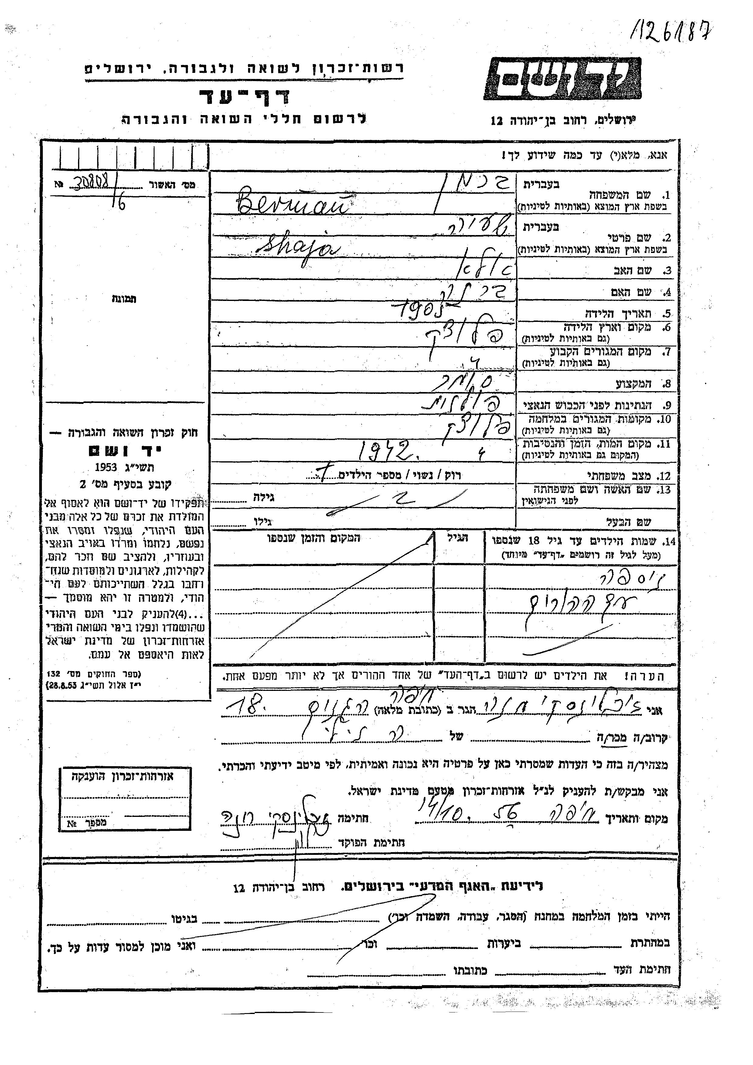 Berman Shaia 1905 Plock, Pologne Feuille de témoignage