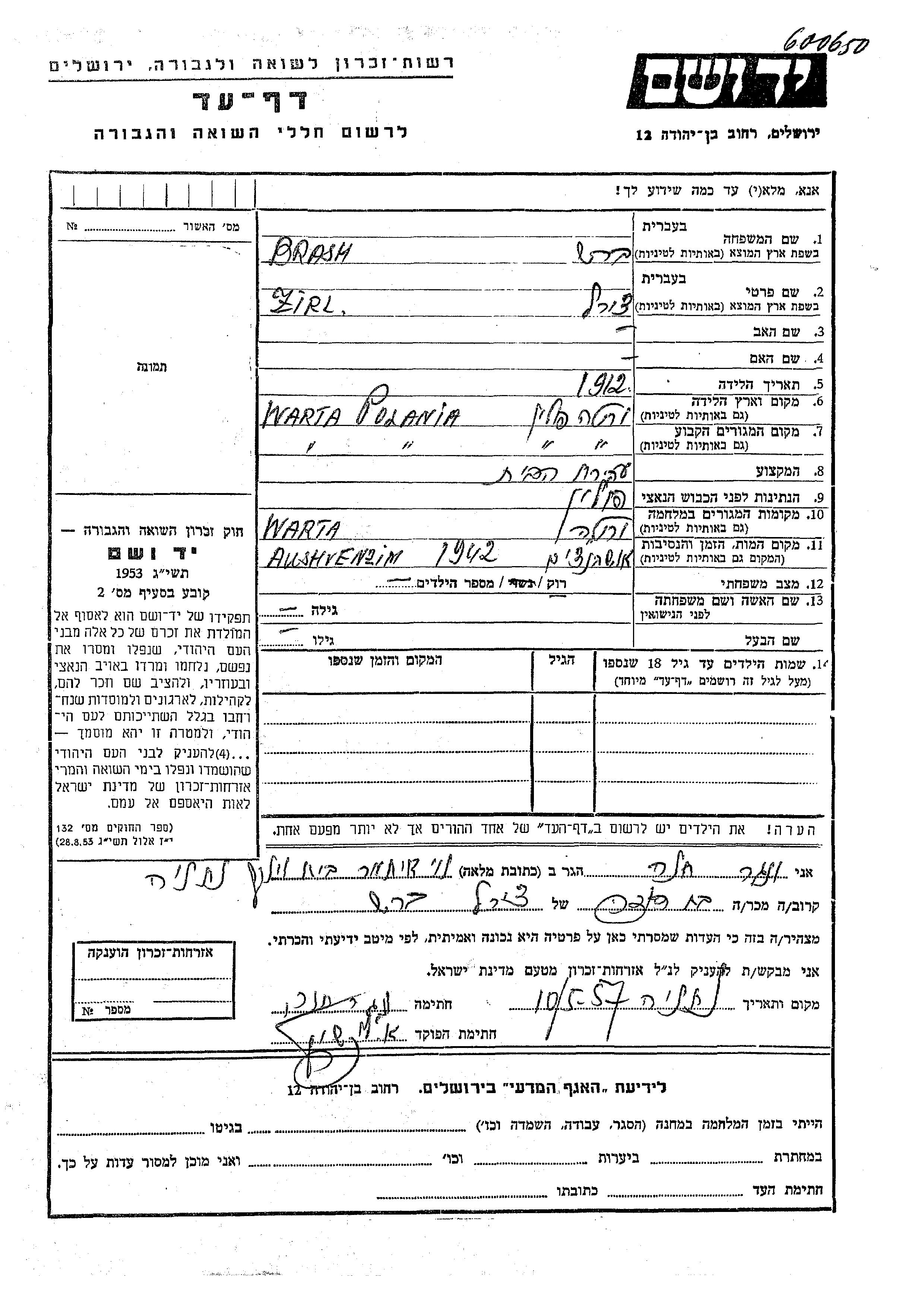 Zirl Brash Barash est née à Warta, Pologne en 1912. Elle était Femme au foyer et Célibataire. Avant la seconde guerre mondiale elle vivait à Warta, Pologne. Pendant la guerre, elle était à Warta, Pologne.