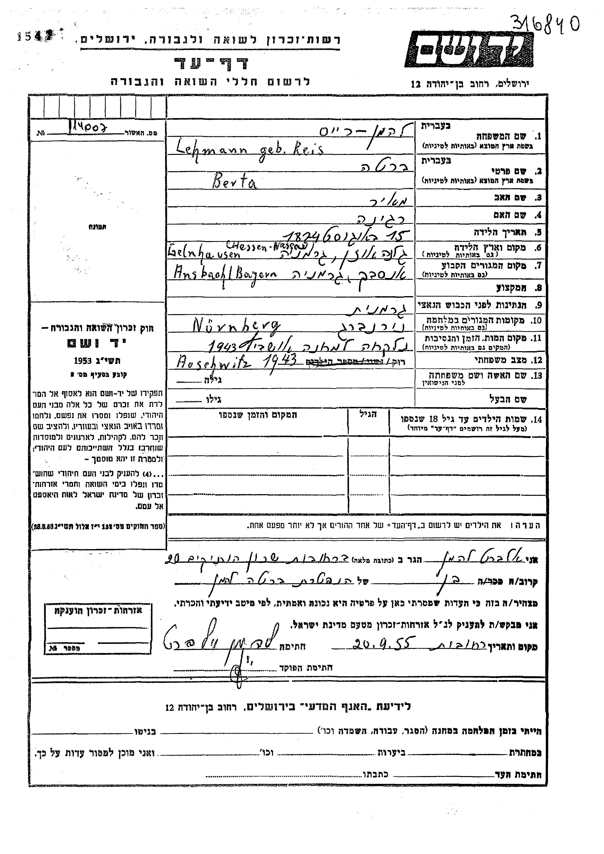 Berta Lehman Reis est née à Gelnhausen, Allemagne en 1874, fille de Meir et de Regina. Elle était Célibataire. Avant la seconde guerre mondiale elle vivait à Ansbach, Allemagne. Pendant la guerre, elle était à Nuremberg, Allemagne.