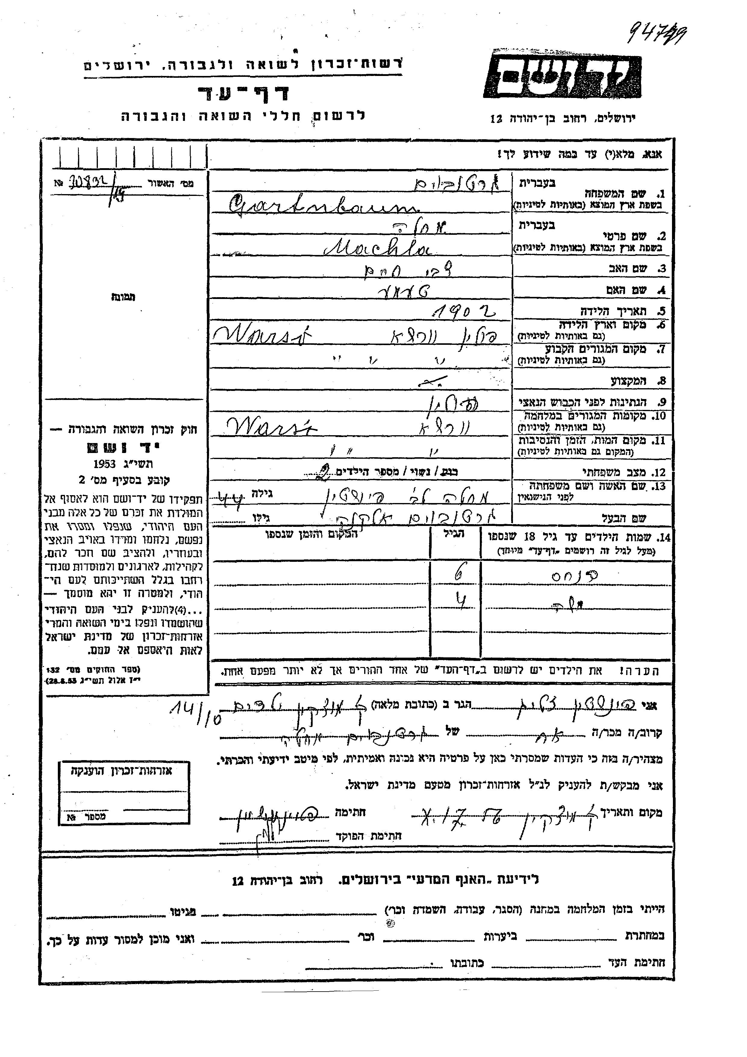 Gartenbaum Machla 1902 Warszawa, Pologne Feuille de témoignage
