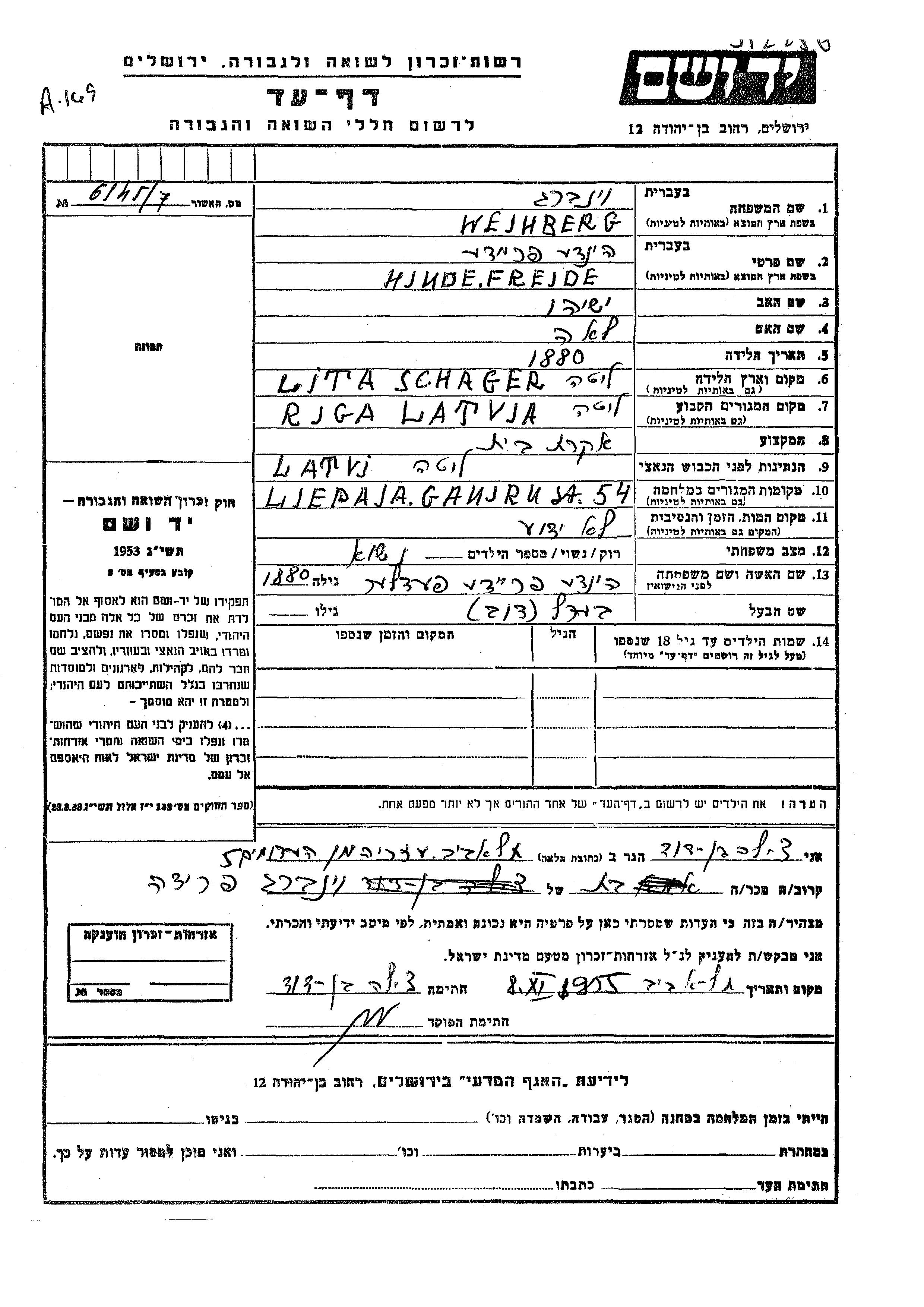 Hinde Freida Wejnberg née Fedler est née à Lituanie en 1880, fille de Ieshaiahu et de Lea. Elle était Femme au foyer et Mariée à Berl Dov. Avant la seconde guerre mondiale elle vivait à Riga, Lettonie. Pendant la guerre, elle était à Liepaja, Lettonie.