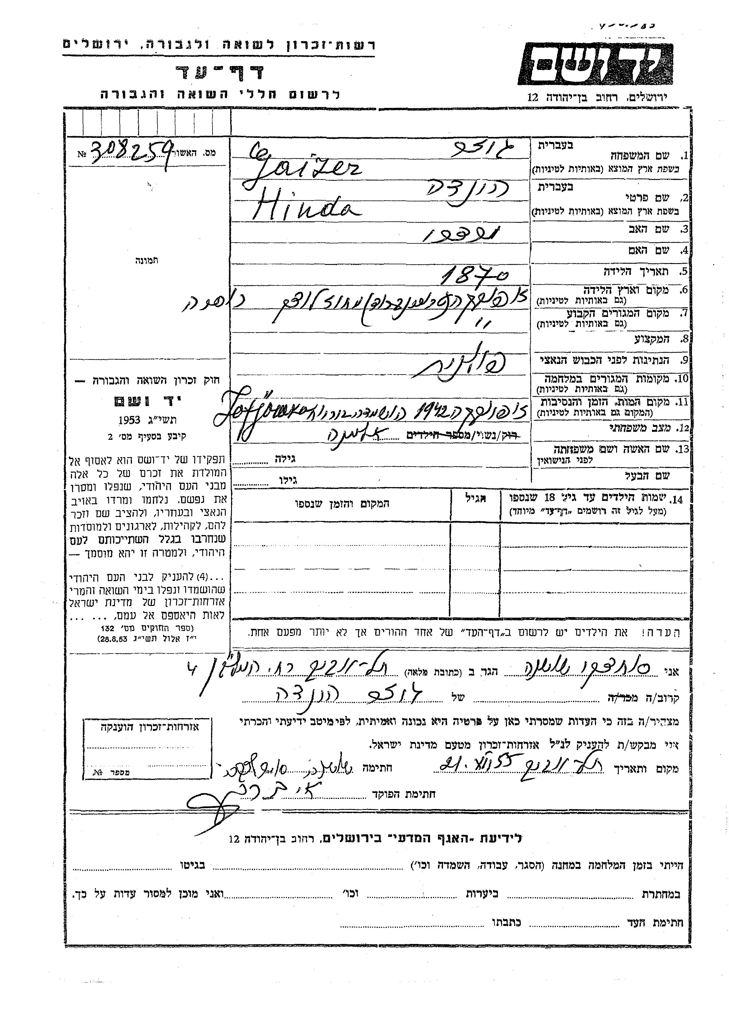 Hinda Gaizer Gizer est née à Zofiowka, Pologne en 1870, fille de Mordekhai. Elle était veuve. Avant la seconde guerre mondiale elle vivait à Zofiowka, Pologne.