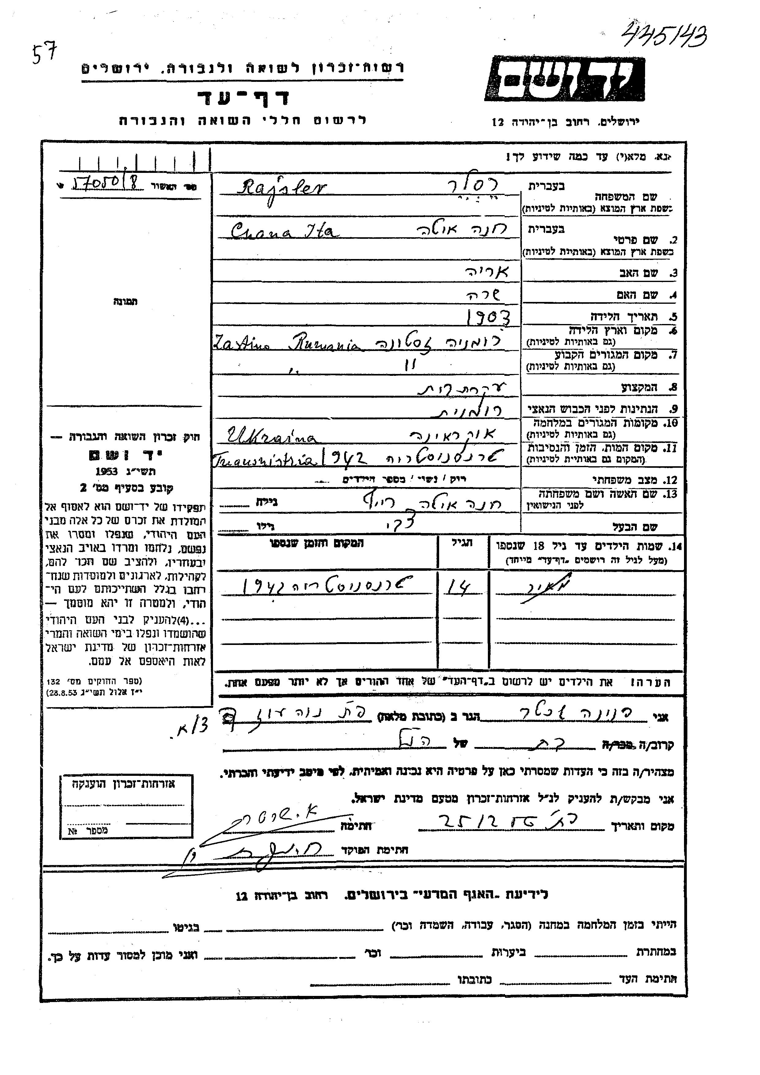 Rajsler Rasler Chana Ita 1903 Zastavna, Roumanie Feuille de témoignage