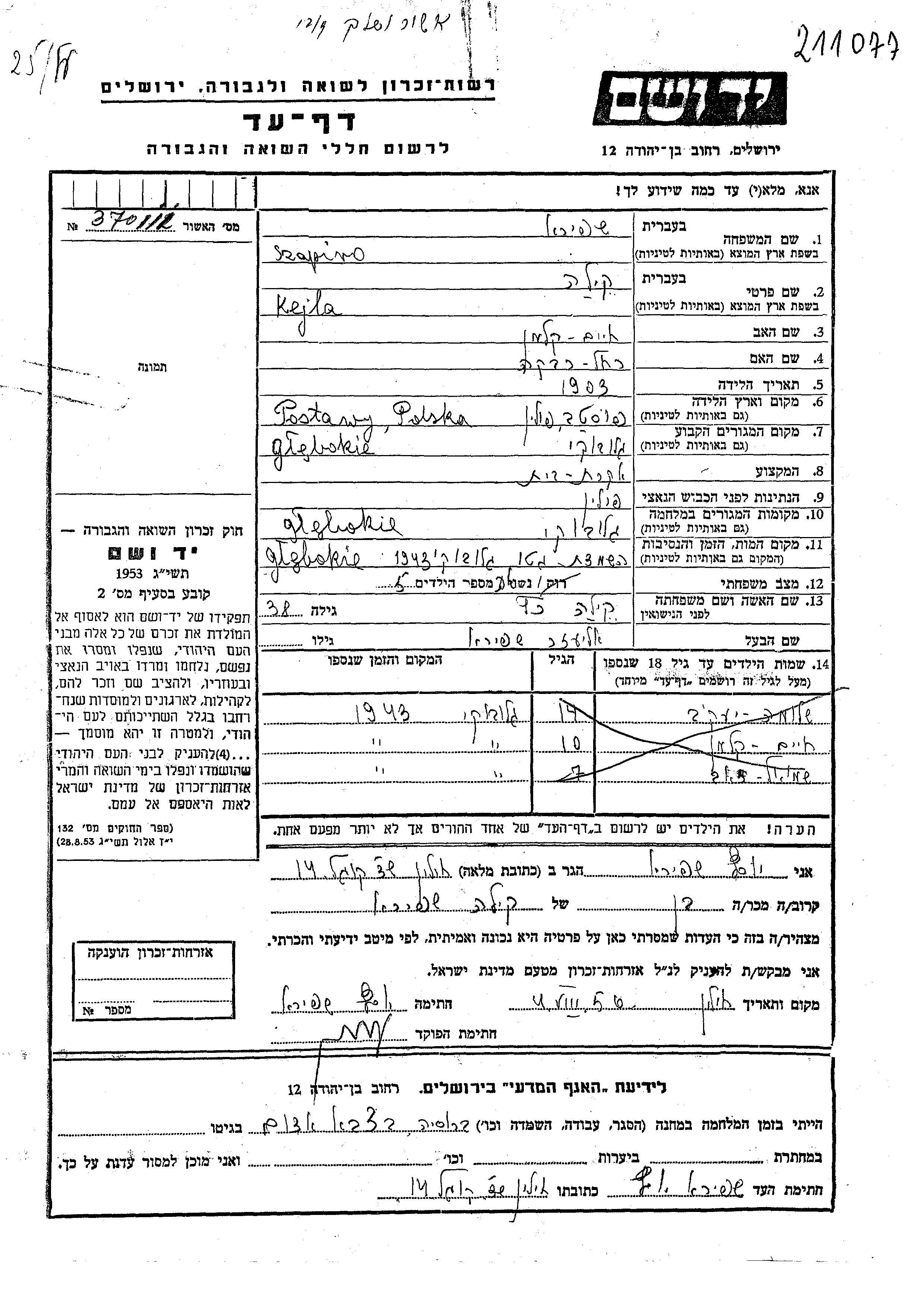 Szapiro Kejla 1903 Glebokie, Pologne Feuille de témoignage