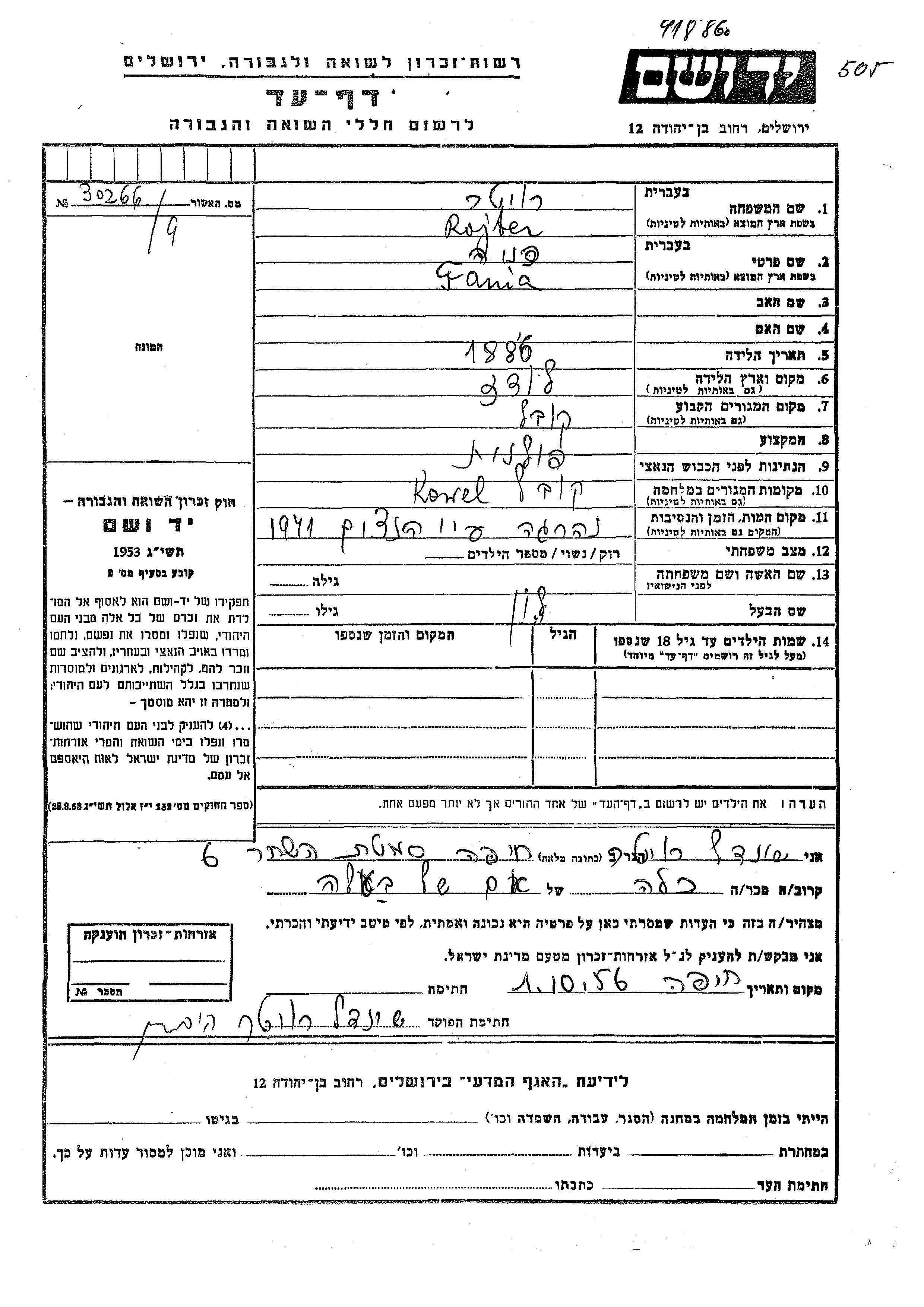 Rojter Fania 1886 Kowel, Pologne Feuille de témoignage