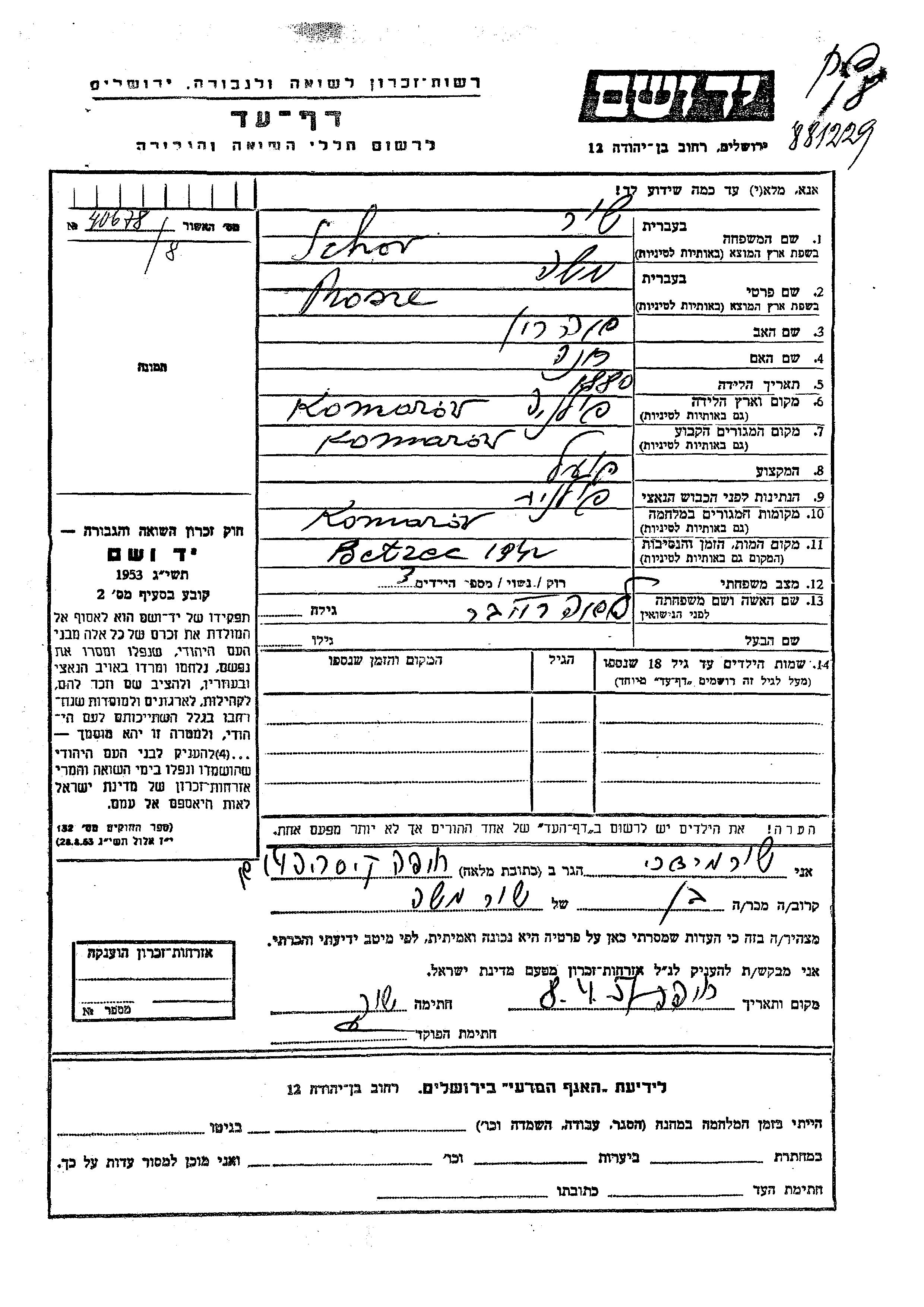 Mosze Schor est né à Komorow, Pologne en 1880, fils de Aharon et de Khana. Il était Ouvrier/e et Mariée à Lea née Reiber. Avant la seconde guerre mondiale il vivait à Komorow, Pologne. Au cours de la guerre, il était à Komorow, Pologne.
