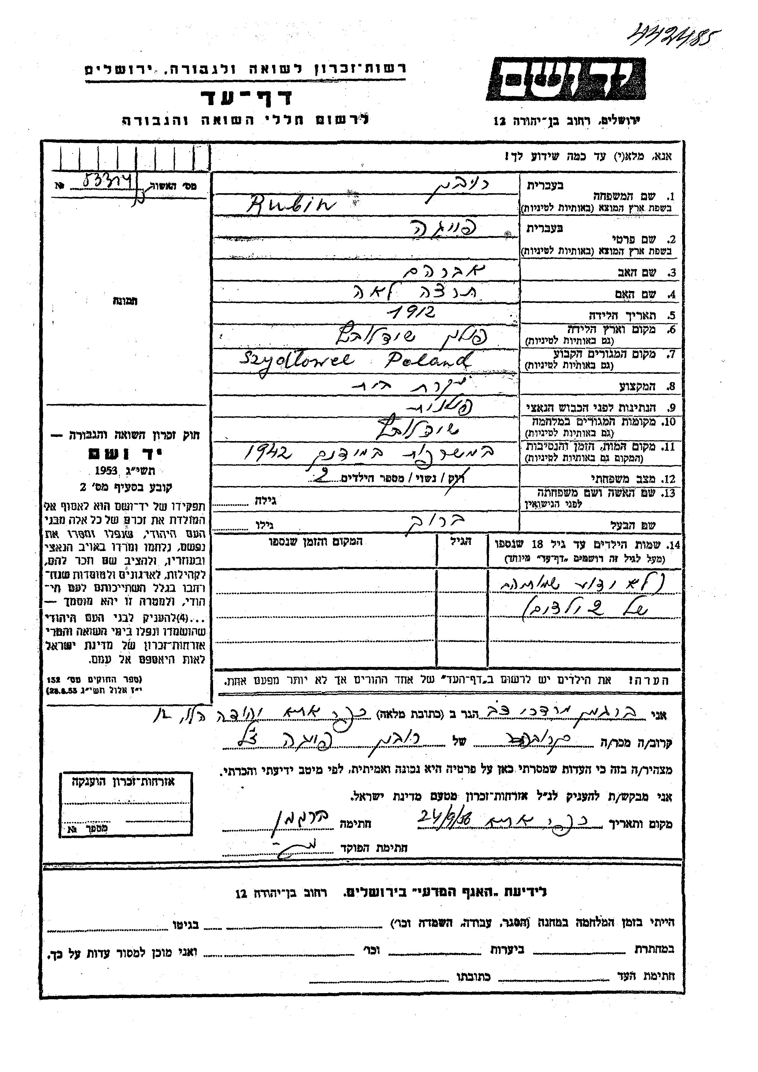 Rubin Feiga 1912 Szydlowce, Pologne Feuille de témoignage