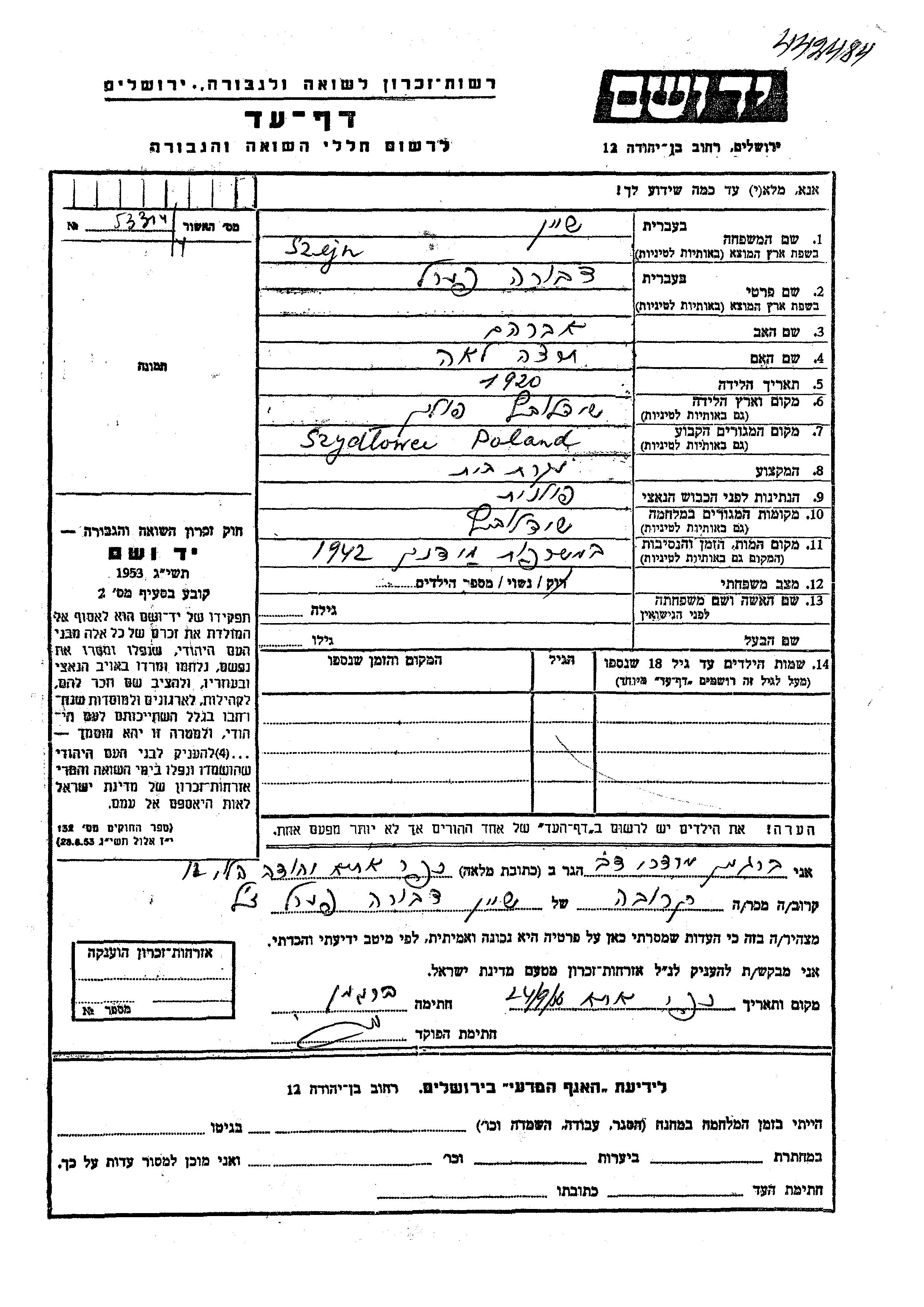 Yad Vashem - Pages of Testimony Names Memorial Collection