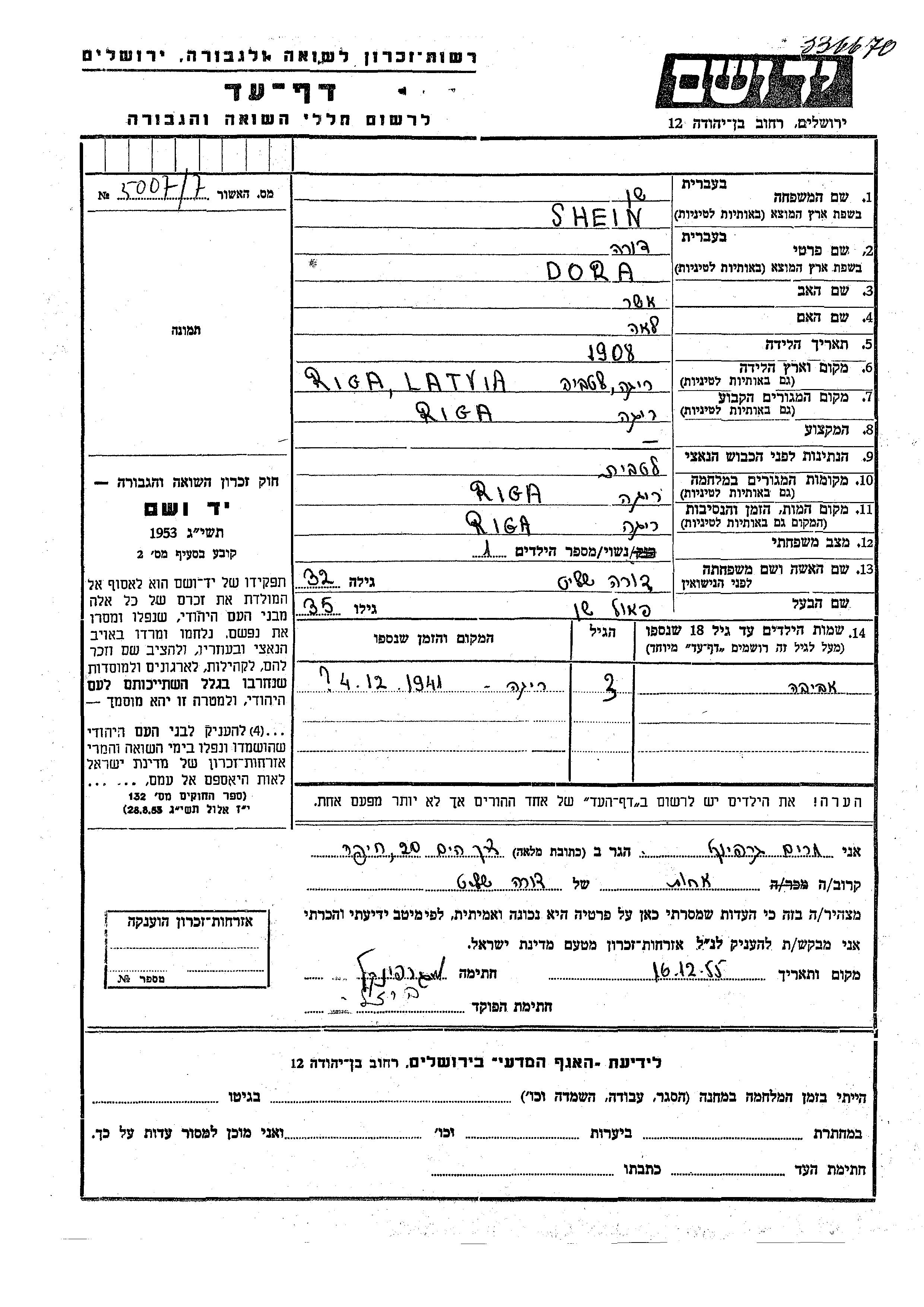 Dora Shein Shen née Shalit est née à Riga, Lettonie en 1908, fille de Asher et de Lea. Elle était Mariée à Paul. Avant la seconde guerre mondiale elle vivait à Riga, Lettonie. Pendant la guerre, elle était à Riga, Lettonie.