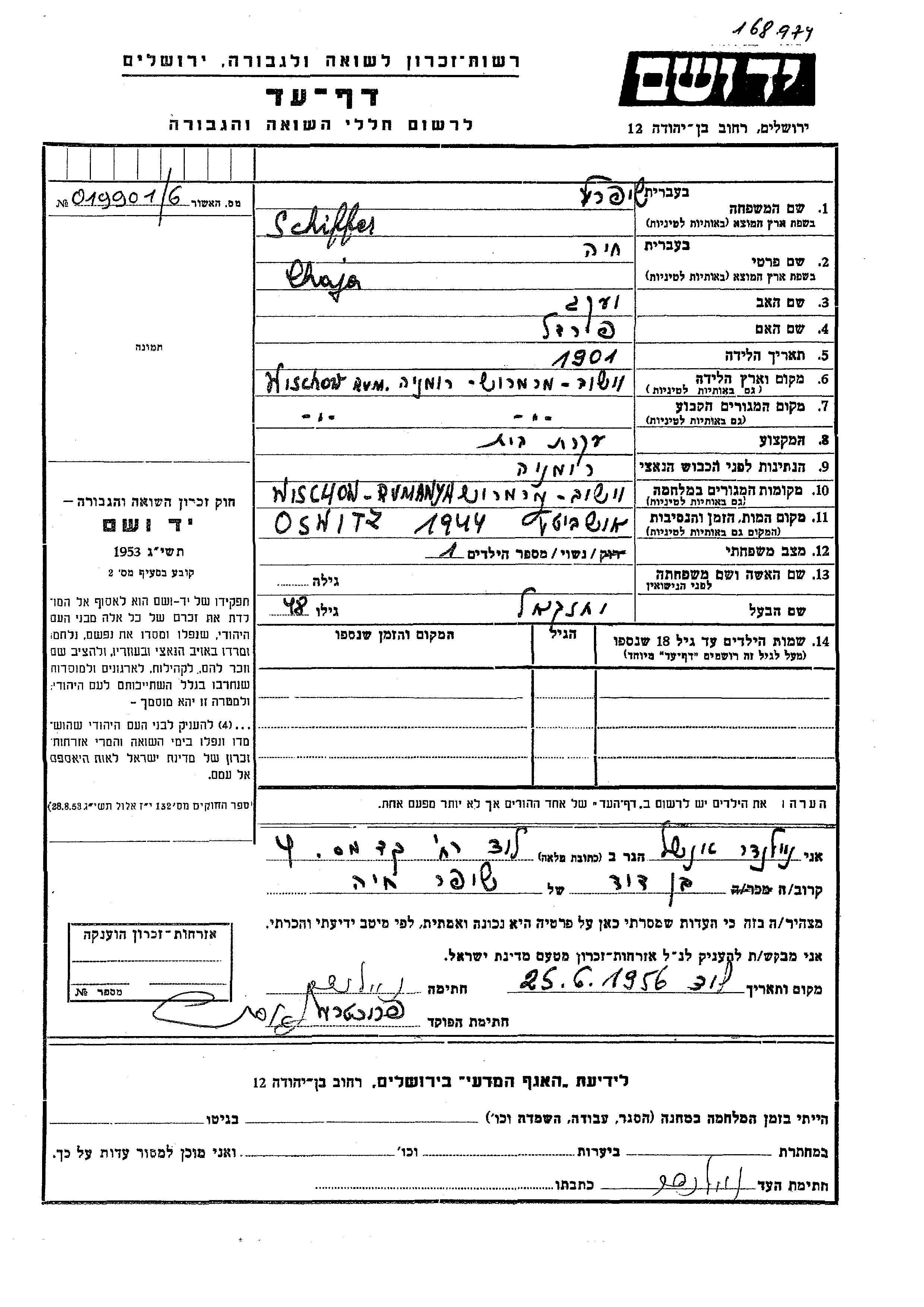 Chaja Schiffer est née à Wischow, Roumanie en 1901, fille de Yaakov et de Fradel. Elle était Femme au foyer et Mariée à Yekhezkel. Avant la seconde guerre mondiale elle vivait à Wischow, Roumanie. Pendant la guerre, elle était à Wischow, Roumanie.