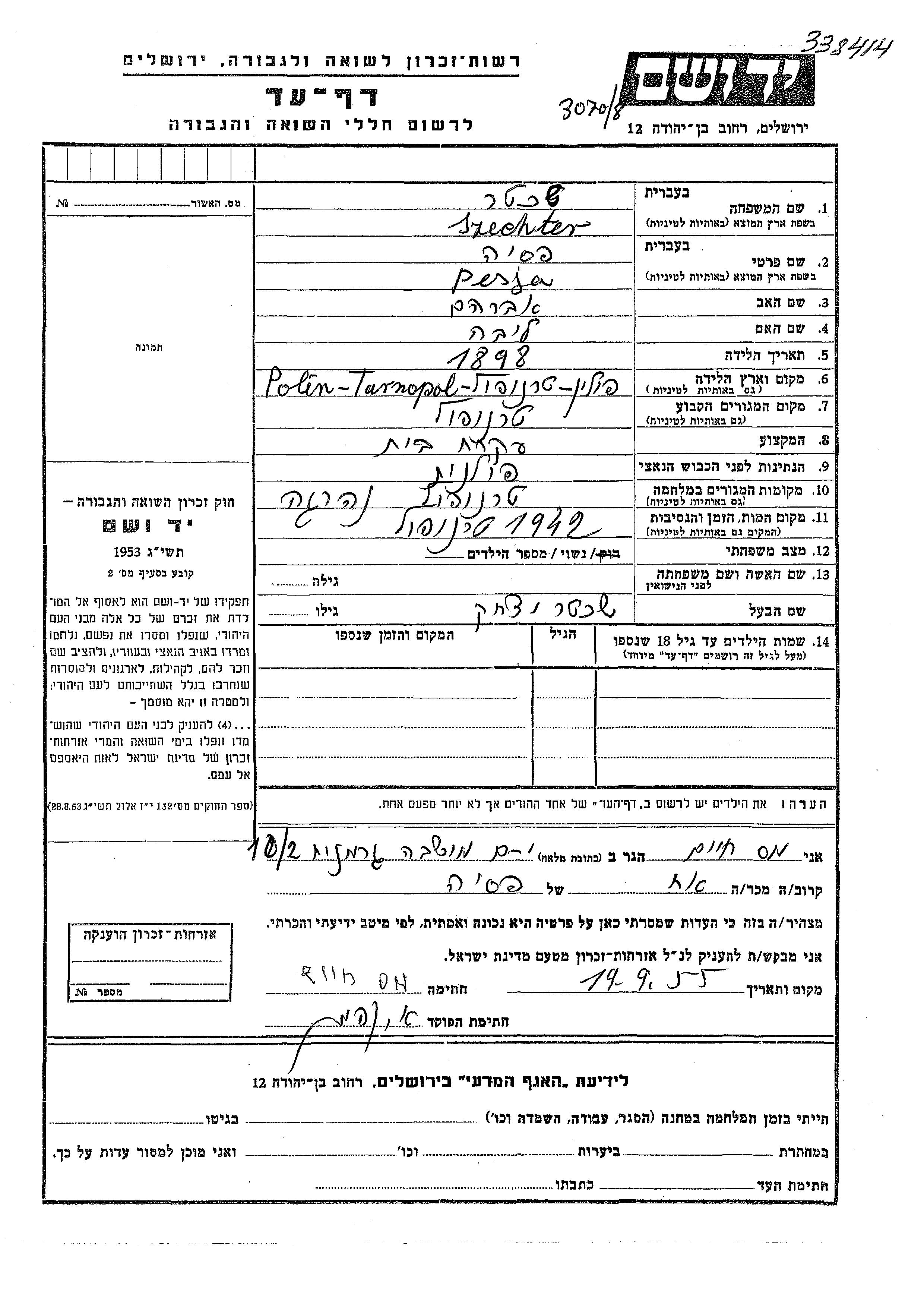 Pesja Szechter est née à Tarnopol, Pologne en 1898, fille de Avraham et de Liba. Elle était Femme au foyer et Mariée à Yitzkhak. Avant la seconde guerre mondiale elle vivait à Tarnopol, Pologne. Pendant la guerre, elle était à Tarnopol, Pologne.