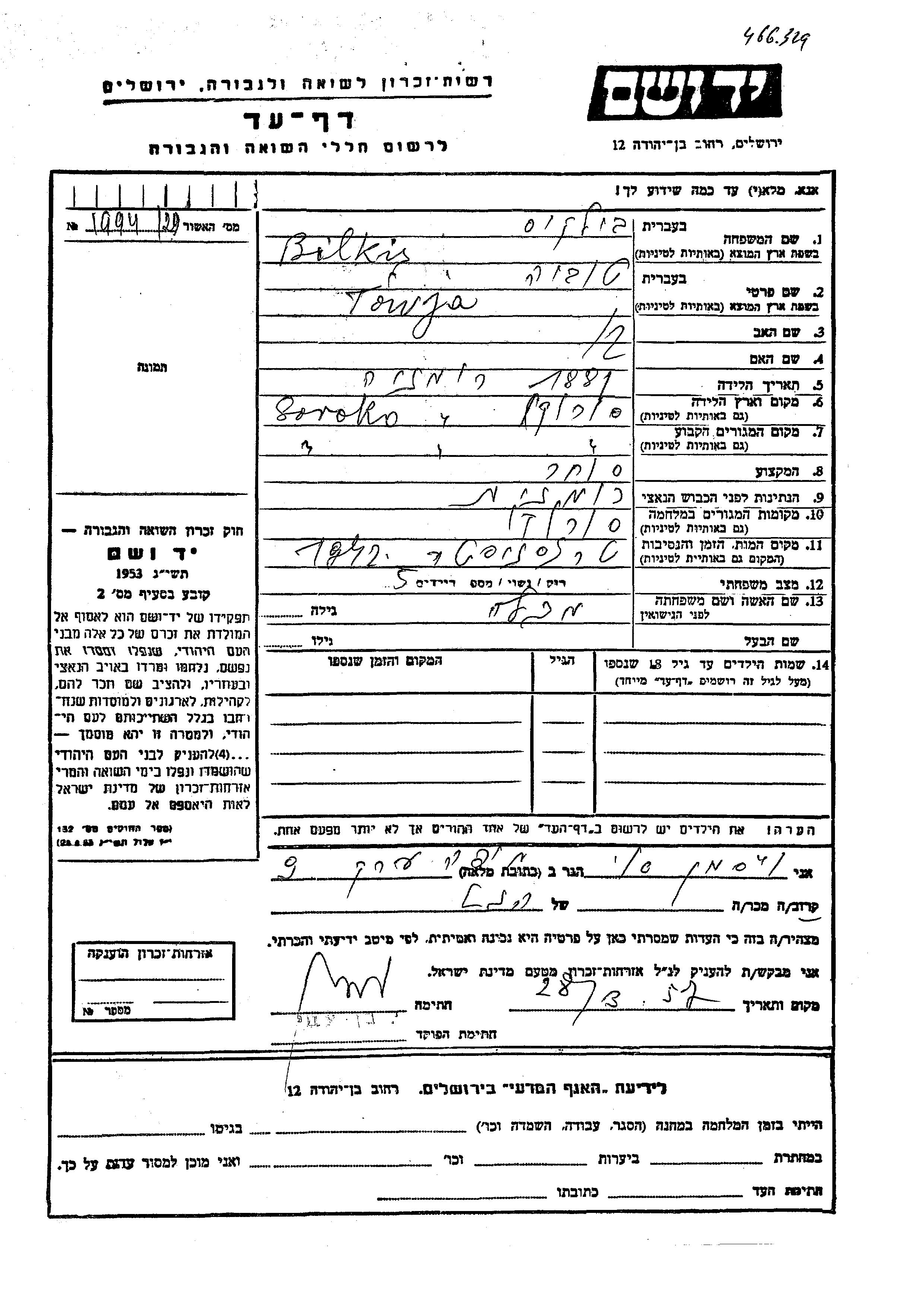 Bilkis Towja 1881 Soroko, Roumanie Feuille de témoignage