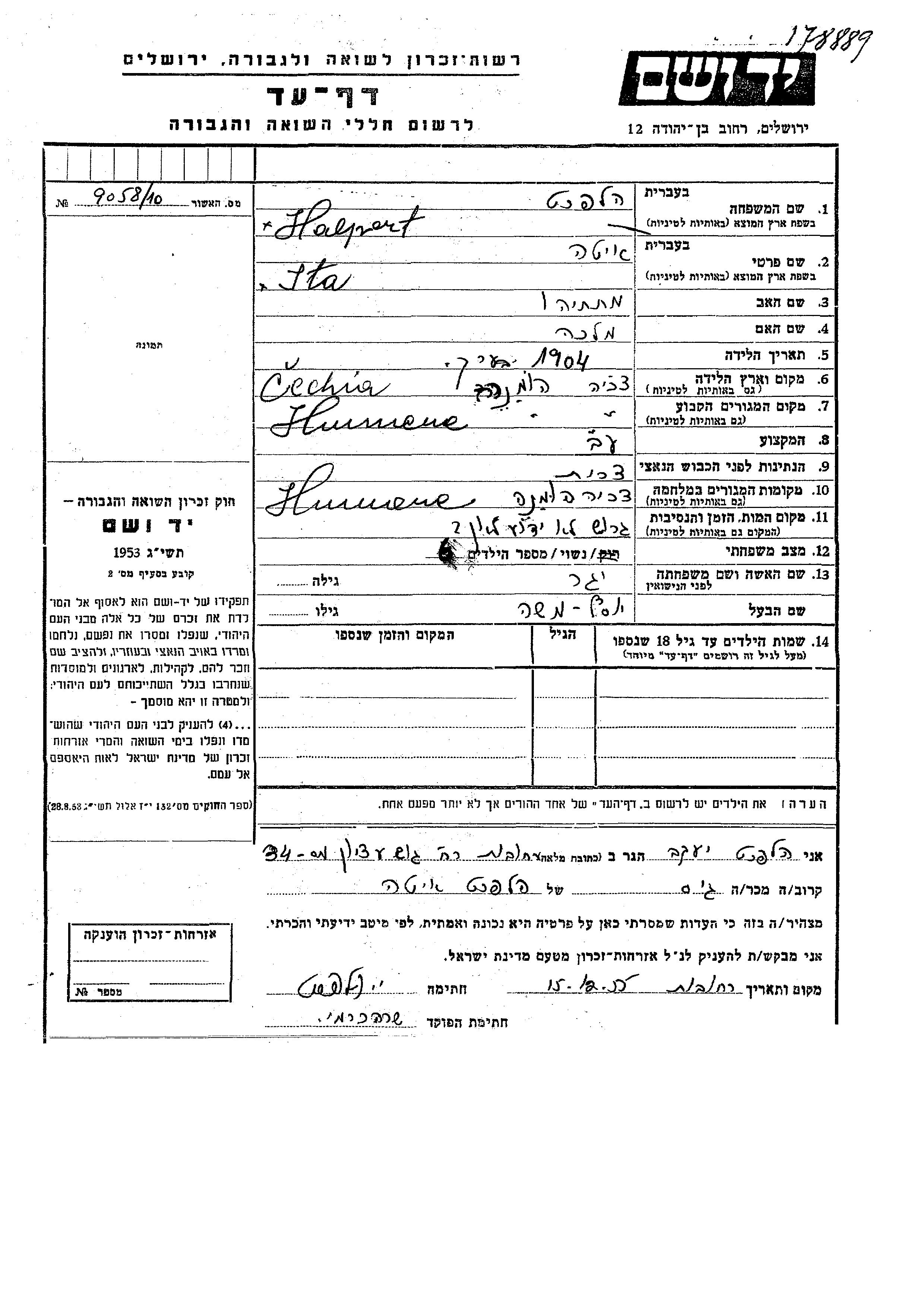 Halpert Ita 1904 Humenne, Tchécoslovaquie Feuille de témoignage