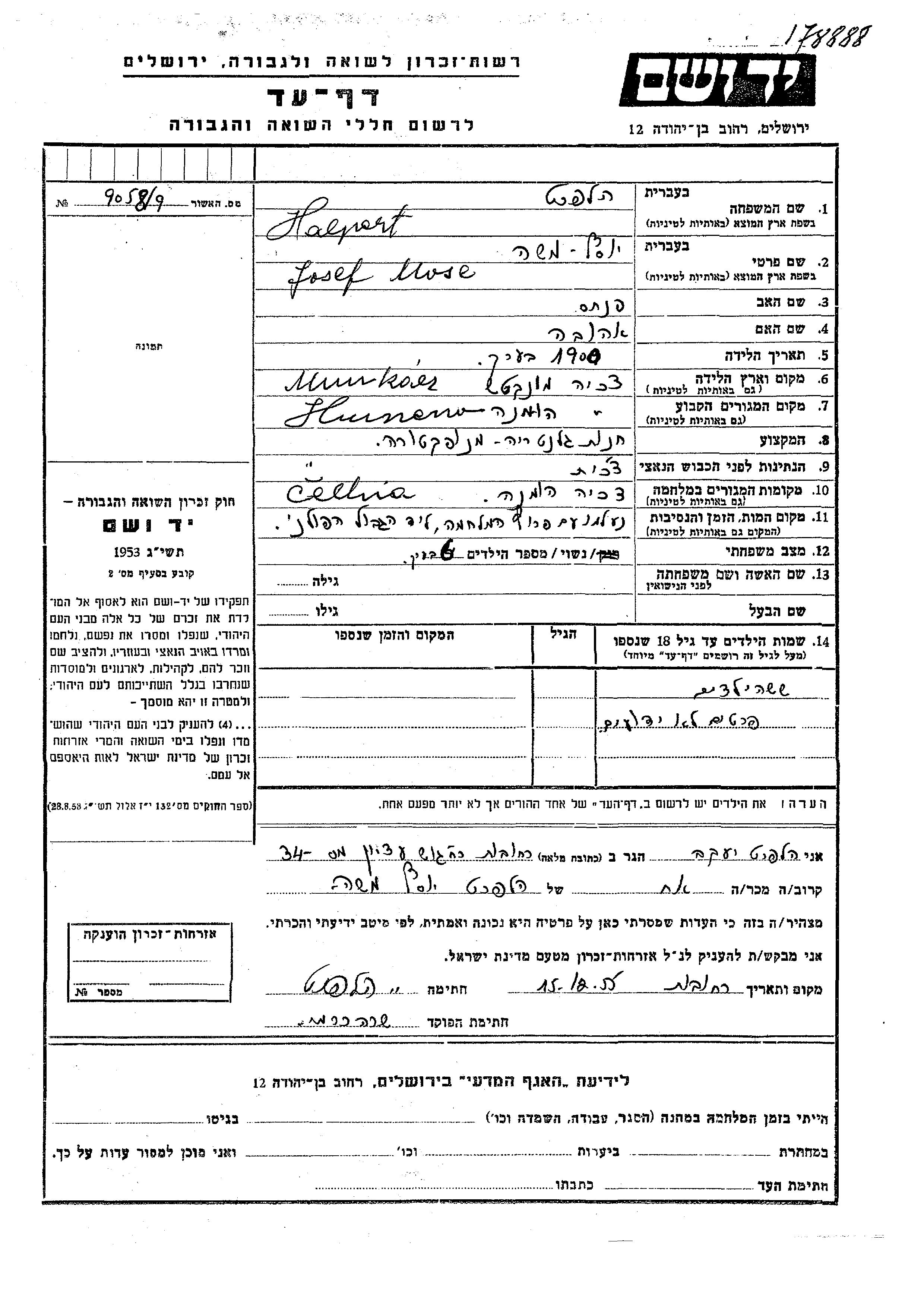 Halpert Mose Yosef 1900 Humenne, Tchécoslovaquie Feuille de témoignage