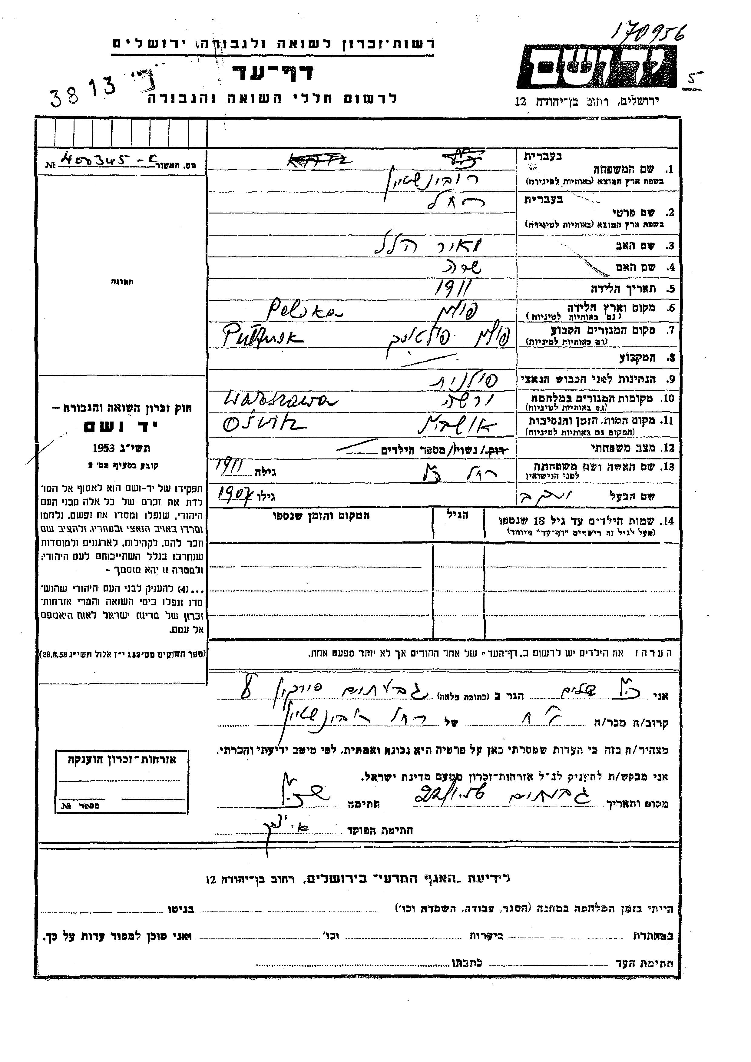 Rubinshtein Rakhel 1911 Pultusk, Pologne Feuille de témoignage