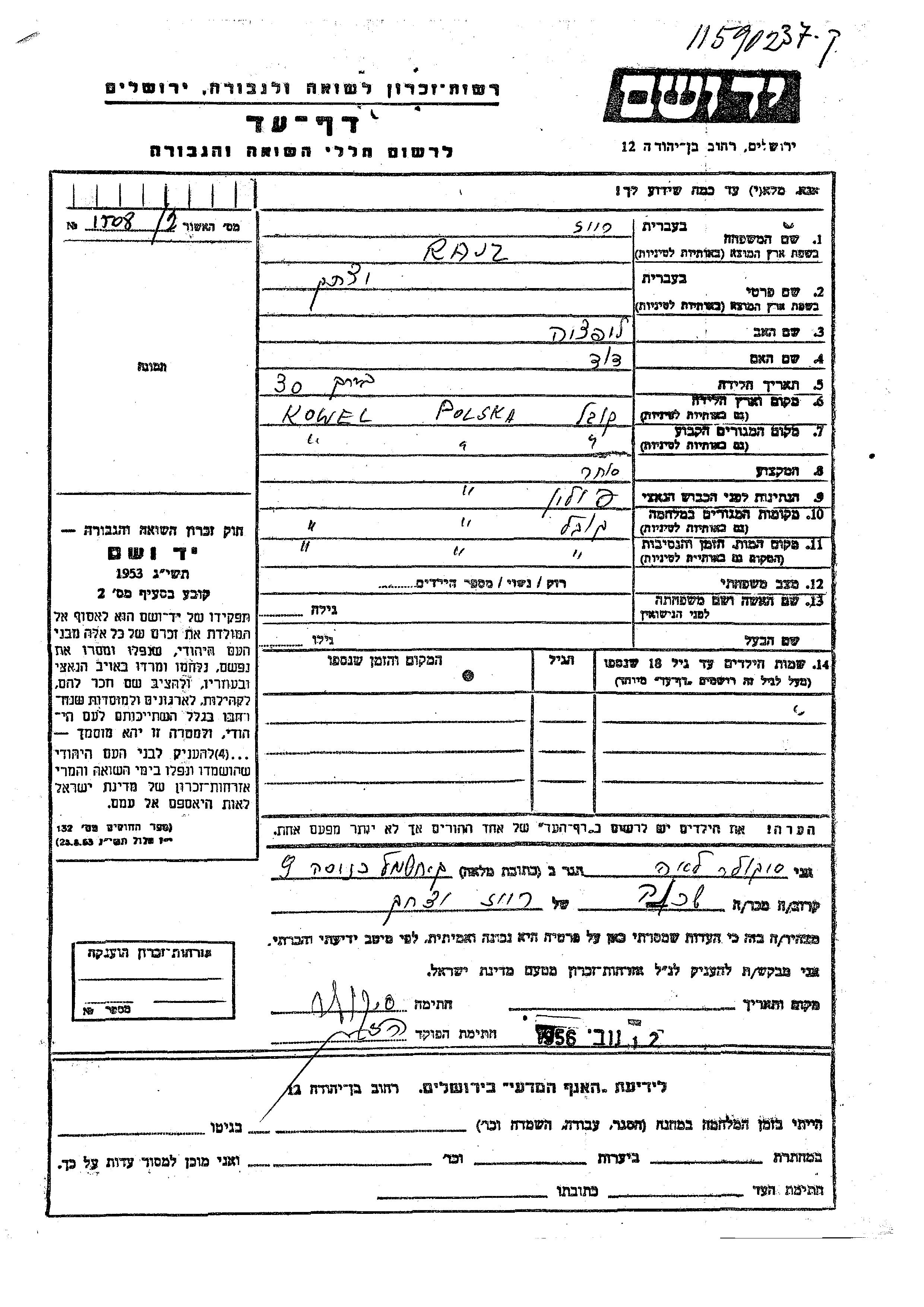 Rajz Yitzkhak Kowel, Pologne Feuille de témoignage