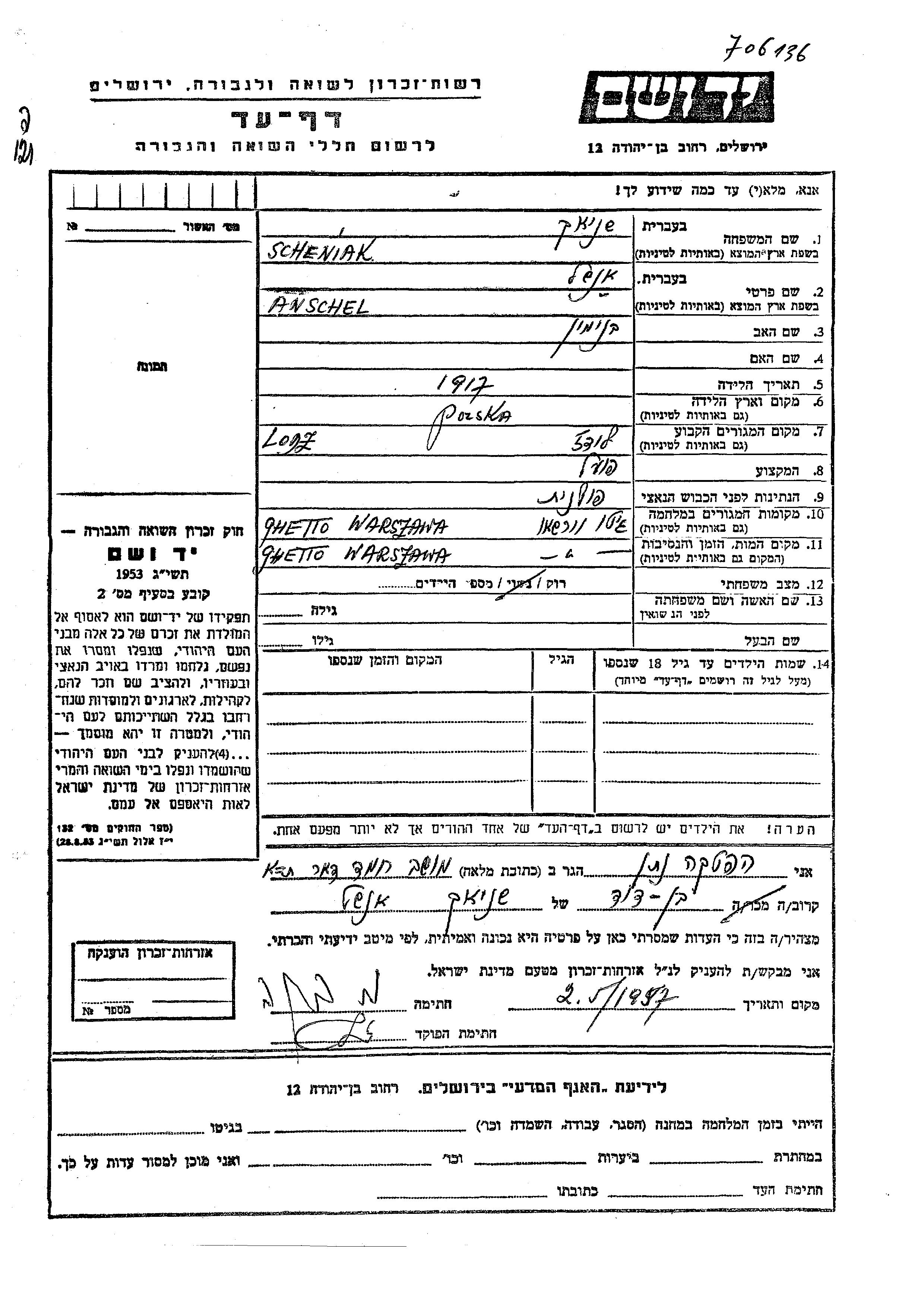 Scheniak Anschel 1917 Lodz, Pologne Feuille de témoignage