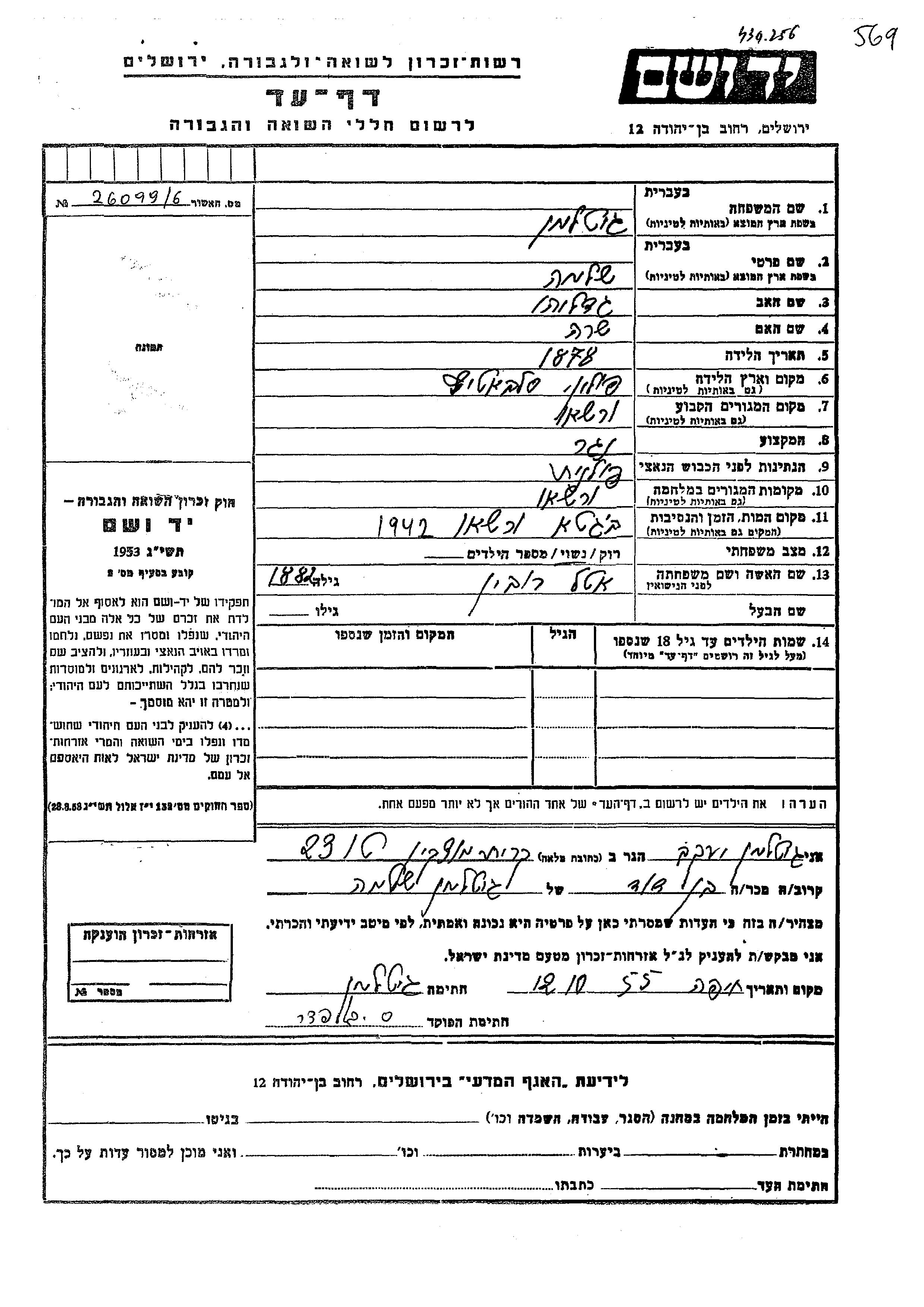 Gitelman Shlomo 1878 Warsaw, Pologne Feuille de témoignage