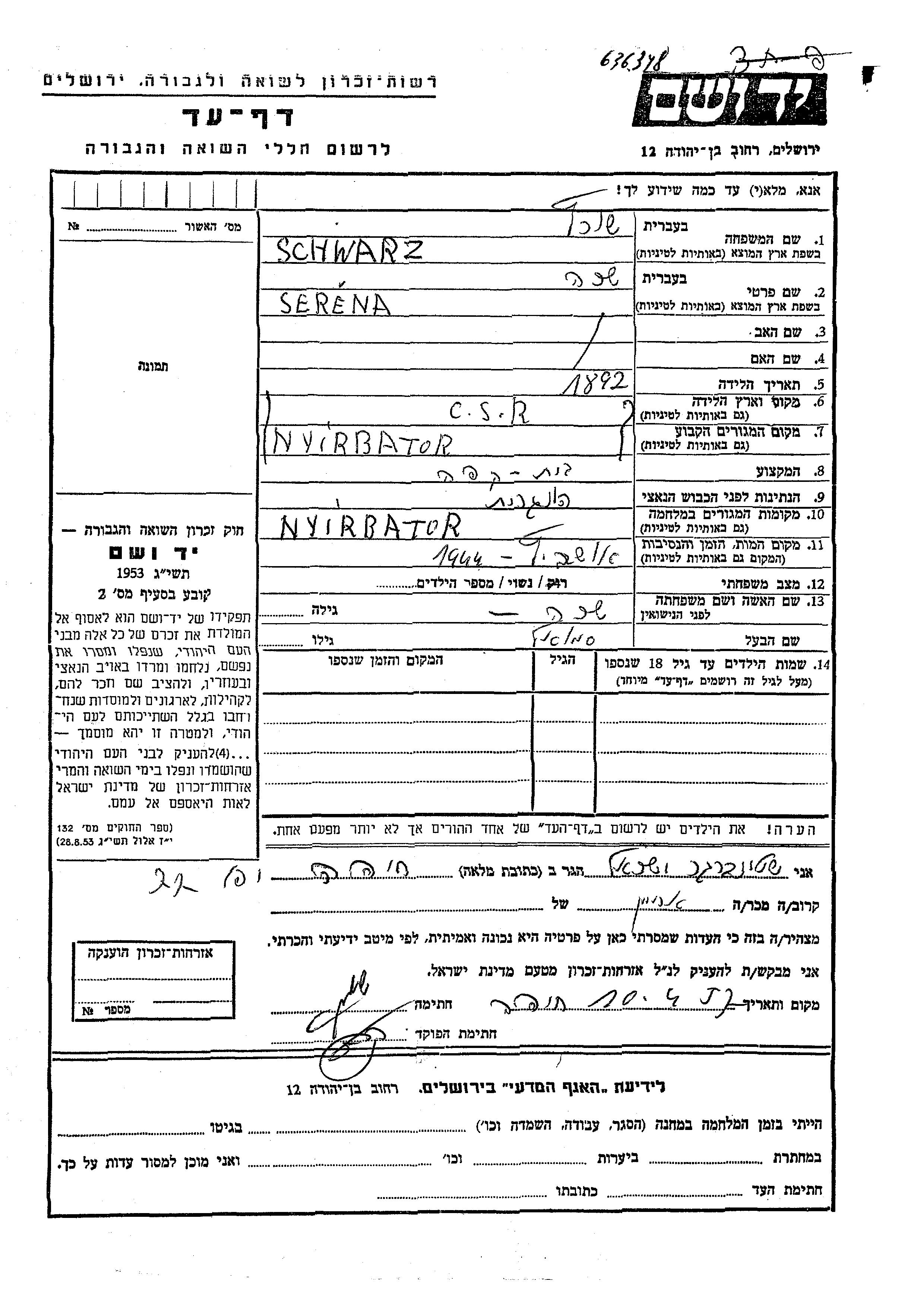 Serena Schwarz est née à Nyirbator, Hongrie en 1892. Elle était Café et Mariée à Samuel. Avant la seconde guerre mondiale elle vivait à Nyirbator, Hongrie. Pendant la guerre, elle était à Nyirbator, Hongrie.