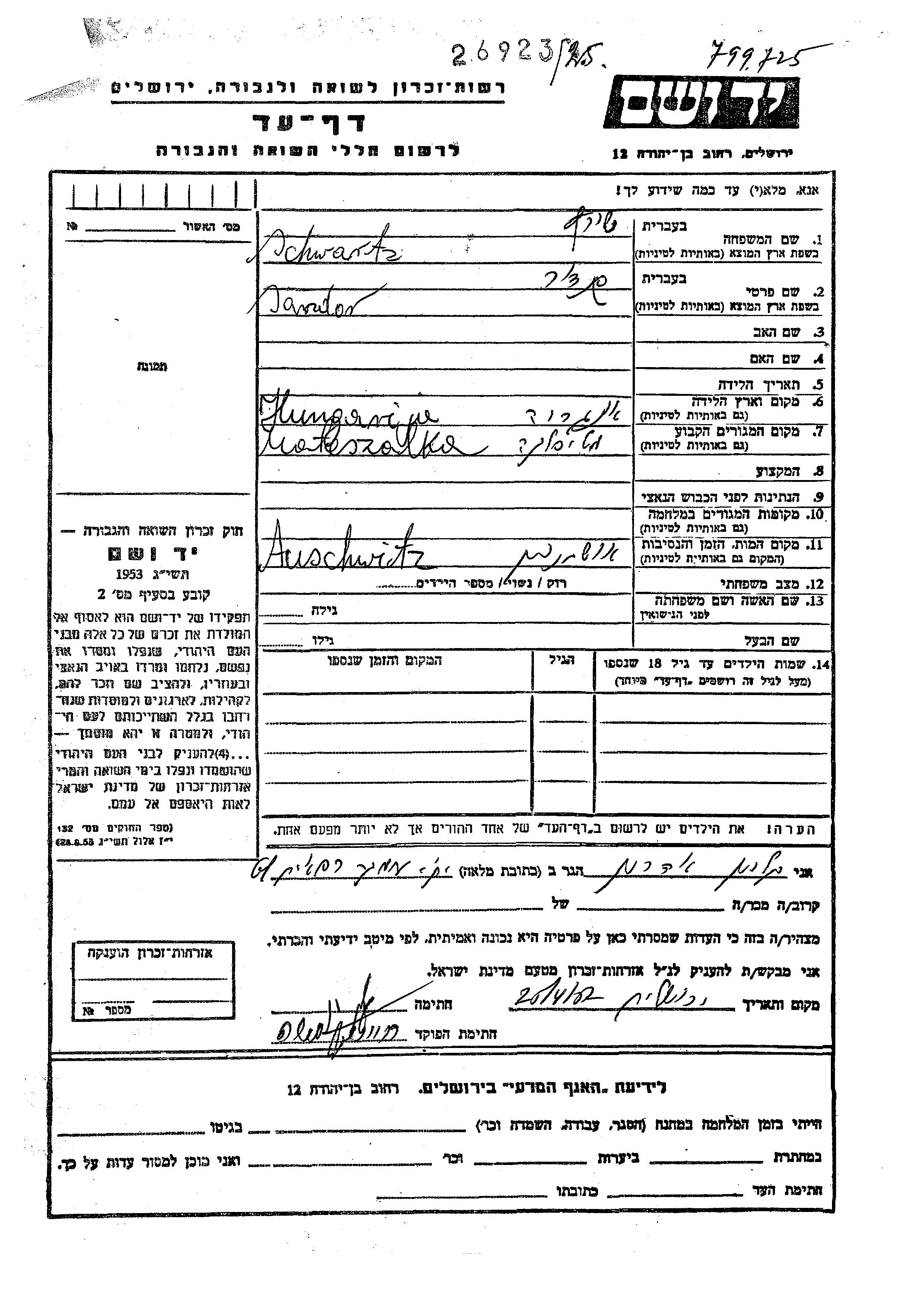Schwartz Sandor Mateszalka, Hongrie Feuille de témoignage