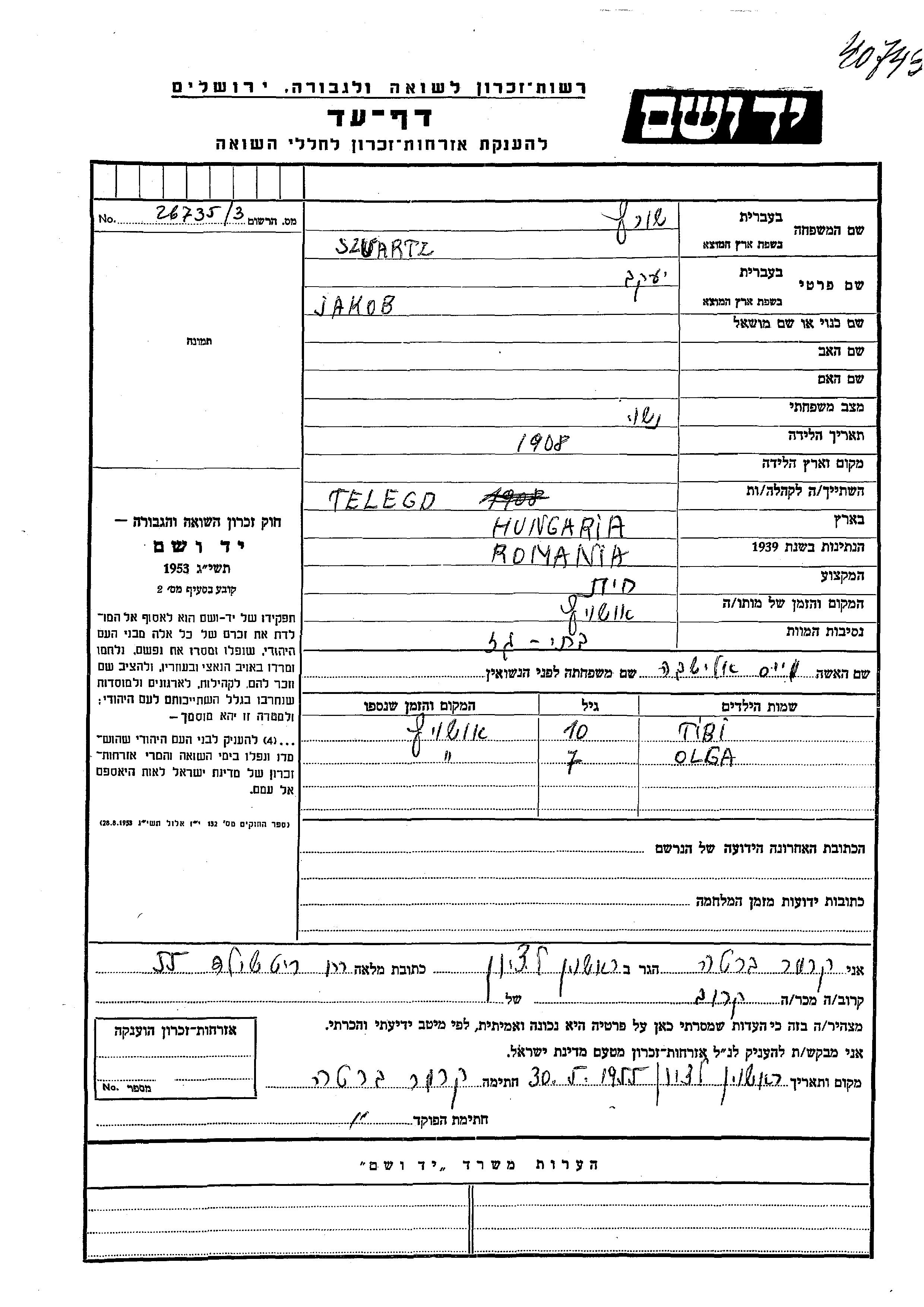 Szvartz Jakob 1908 Telegd, Roumanie Feuille de témoignage
