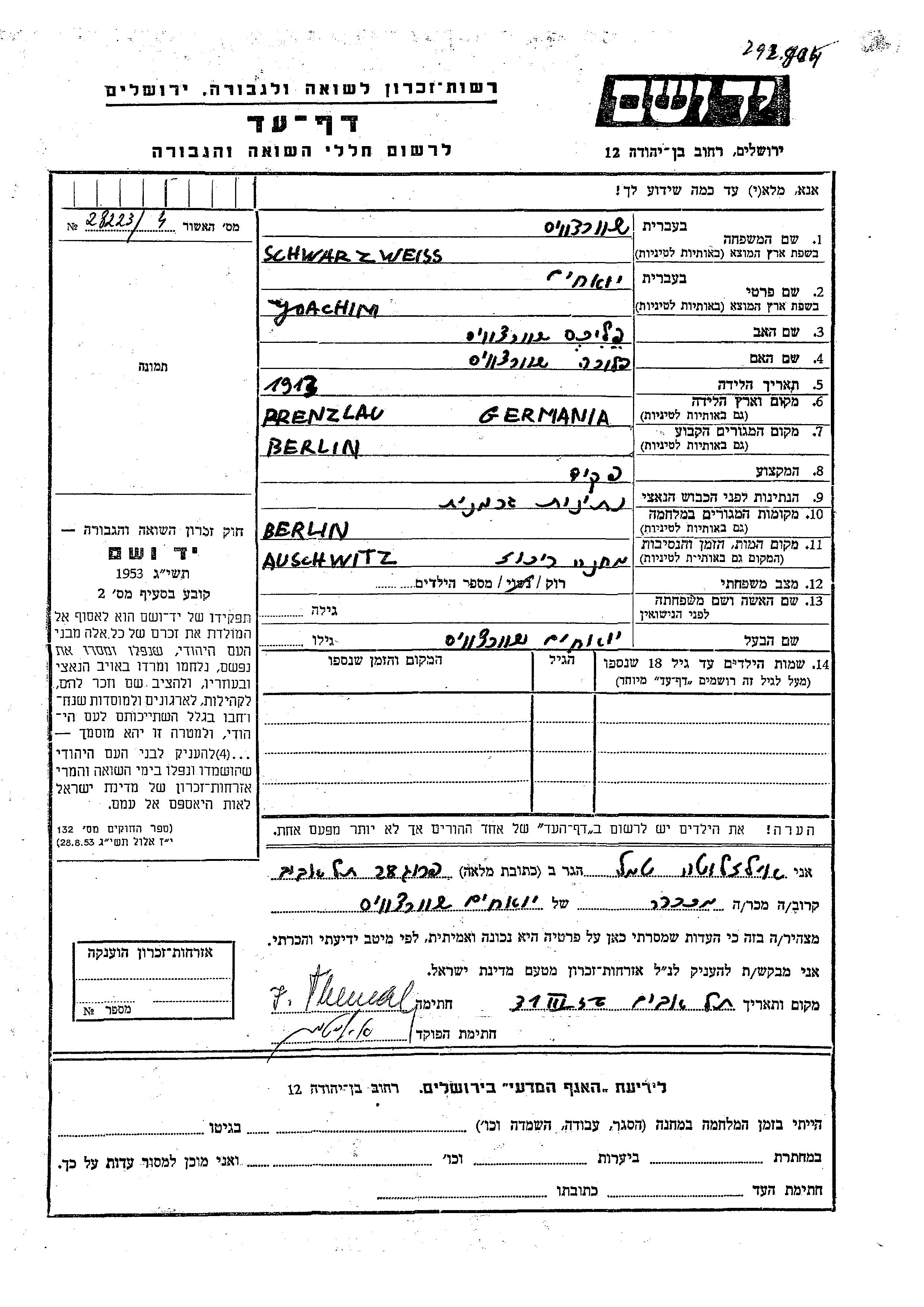 Yoachim Schwarzweiss est né à Prenzlau, Allemagne en 1913, fils de Feliks et de Flora. Il était Employé/e de bureau et Célibataire. Avant la seconde guerre mondiale il vivait à Berlin, Allemagne. Au cours de la guerre, il était à Berlin, Allemagne.