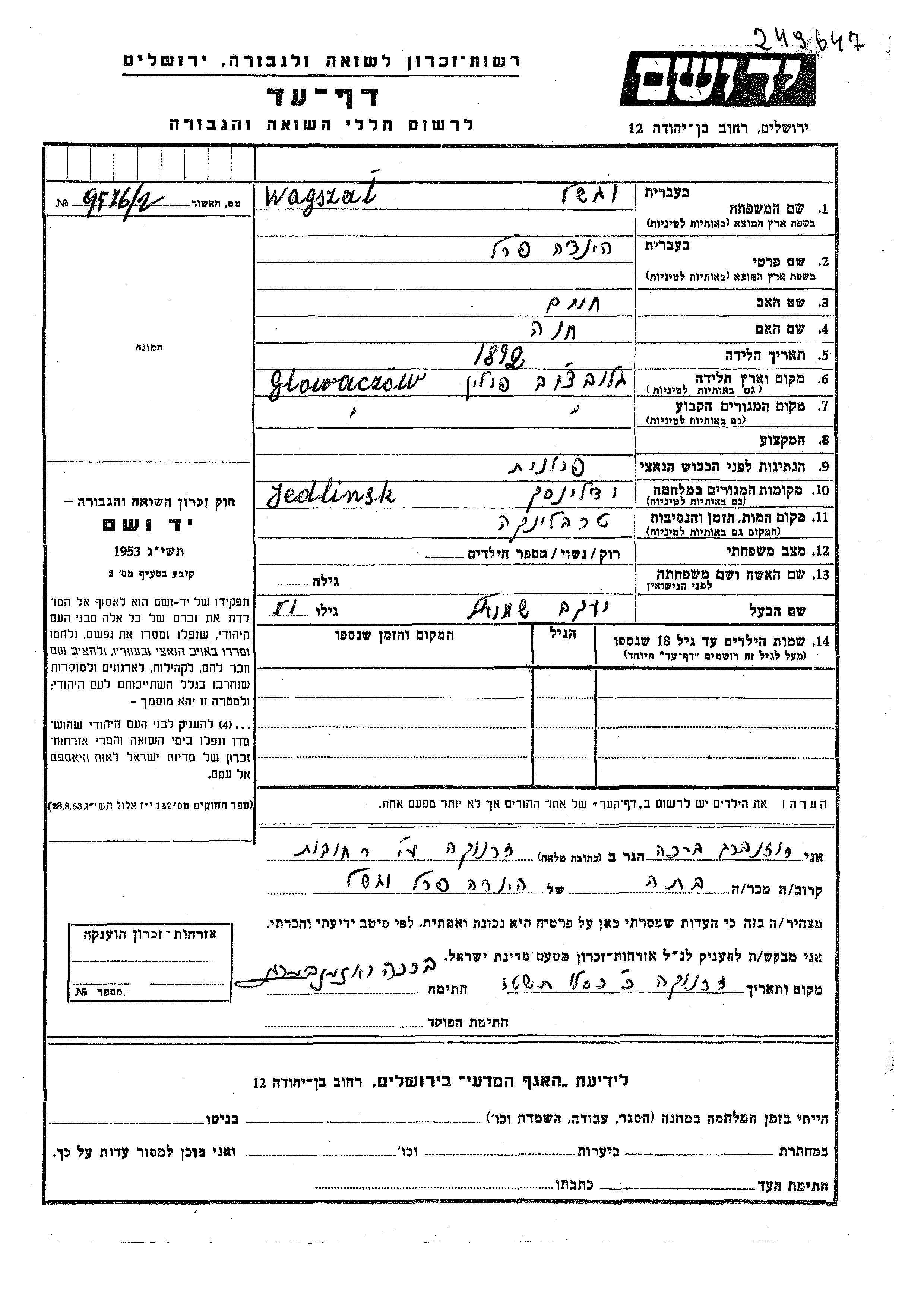 Yad Vashem - Pages of Testimony Names Memorial Collection