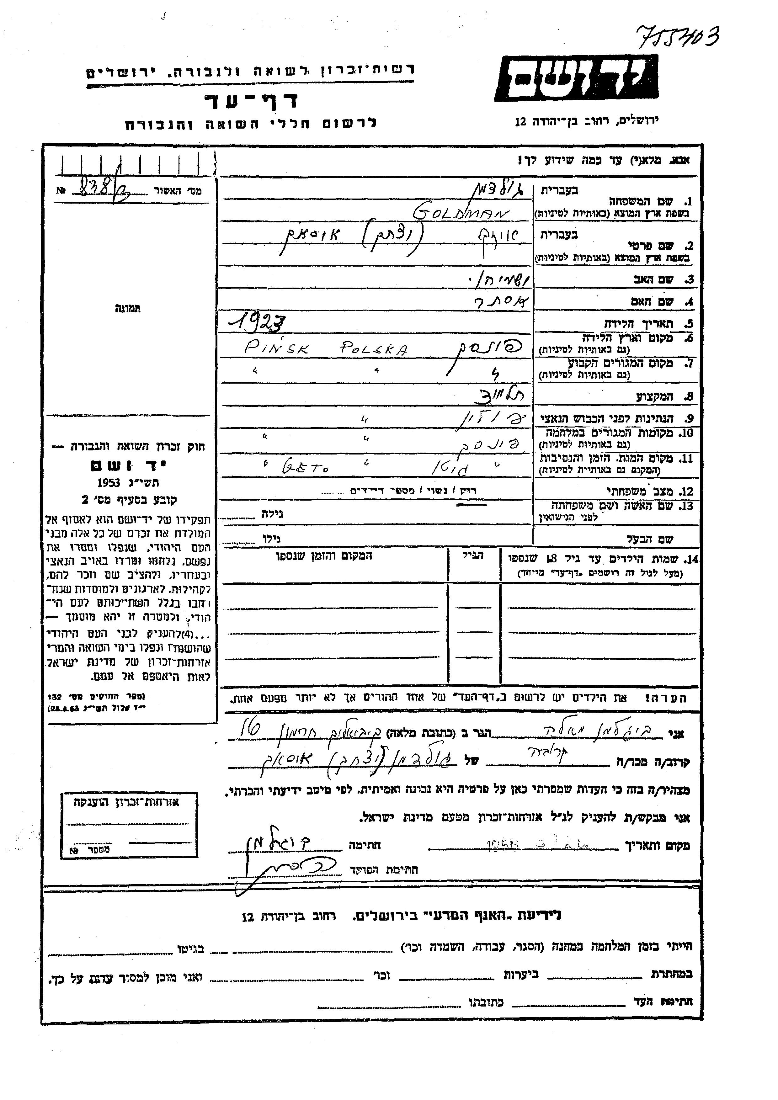 Goldman Izak 1923 Pinsk, Pologne Feuille de témoignage