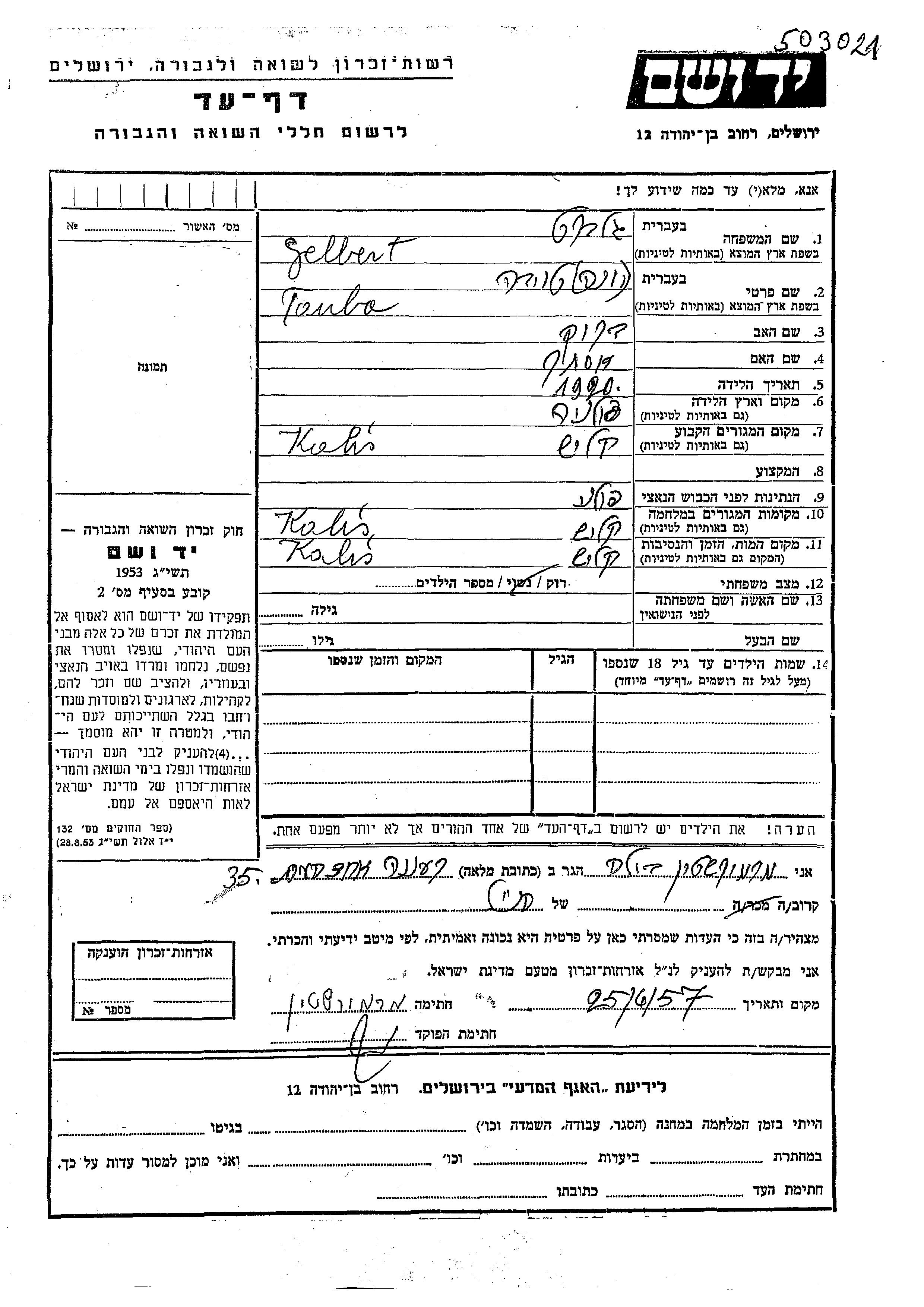 Yad Vashem - Pages of Testimony Names Memorial Collection