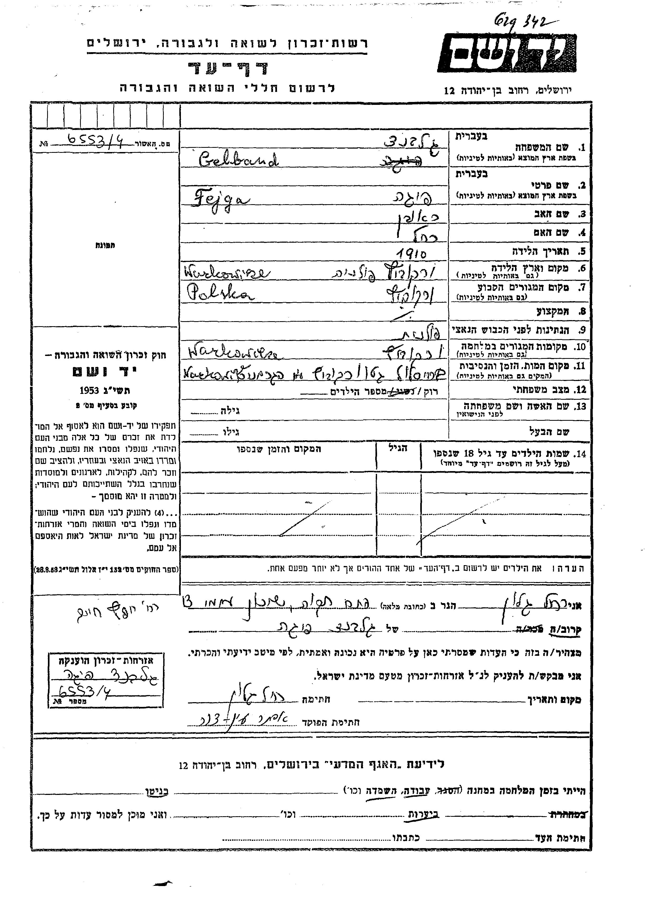 Gelband Fejga 1910 Warkowicze, Pologne Feuille de témoignage