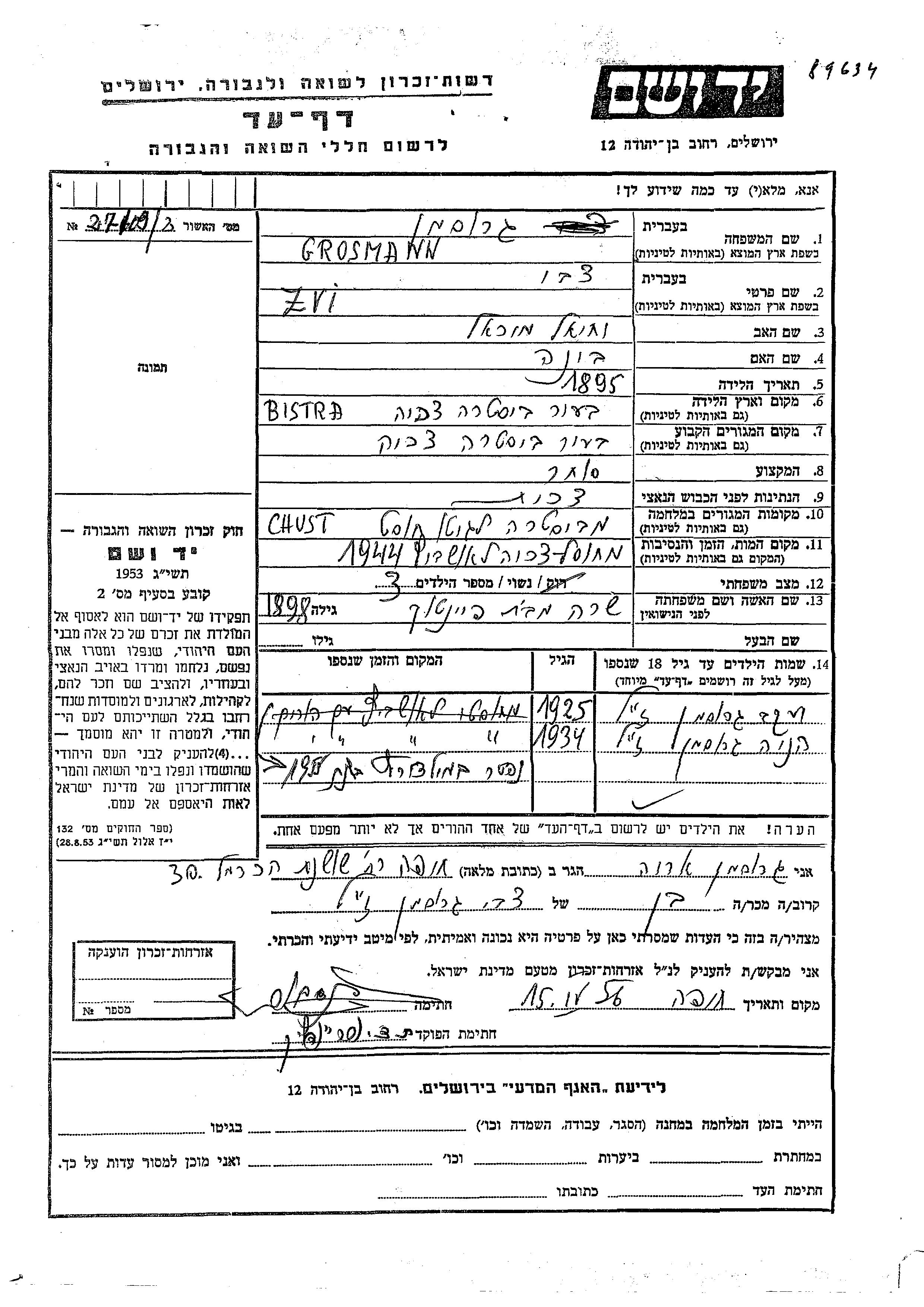 Grosmann Zvi 1895 Bisztra, Tchécoslovaquie Feuille de témoignage
