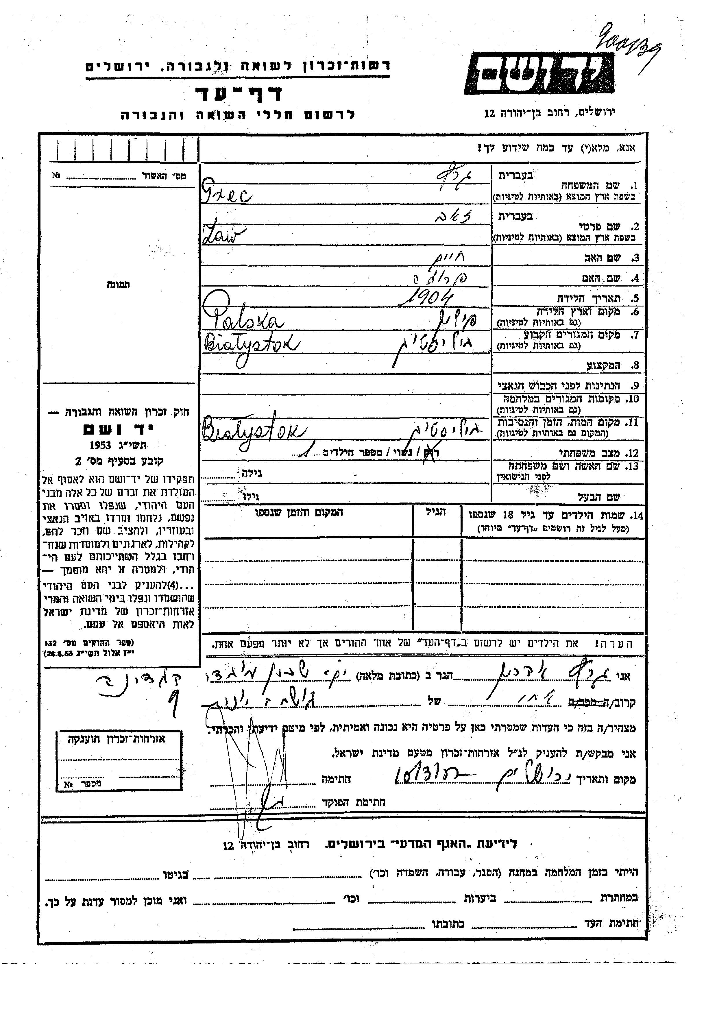 Zaw a été assassiné pendant la Shoah. Lieu de la mort: Bialystok, Pologne.