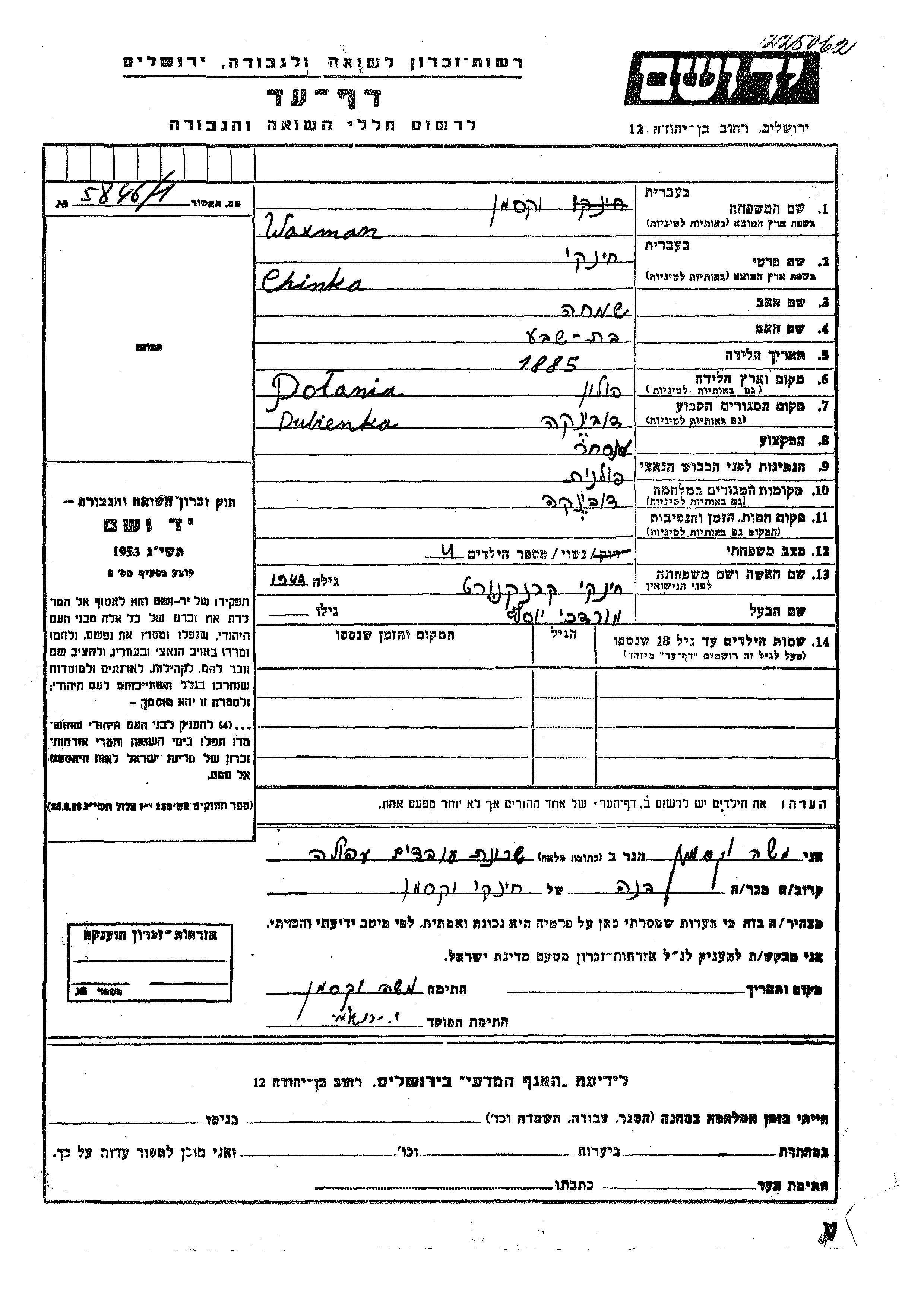 Waxman Chinka 1885 Dubienka, Pologne Feuille de témoignage