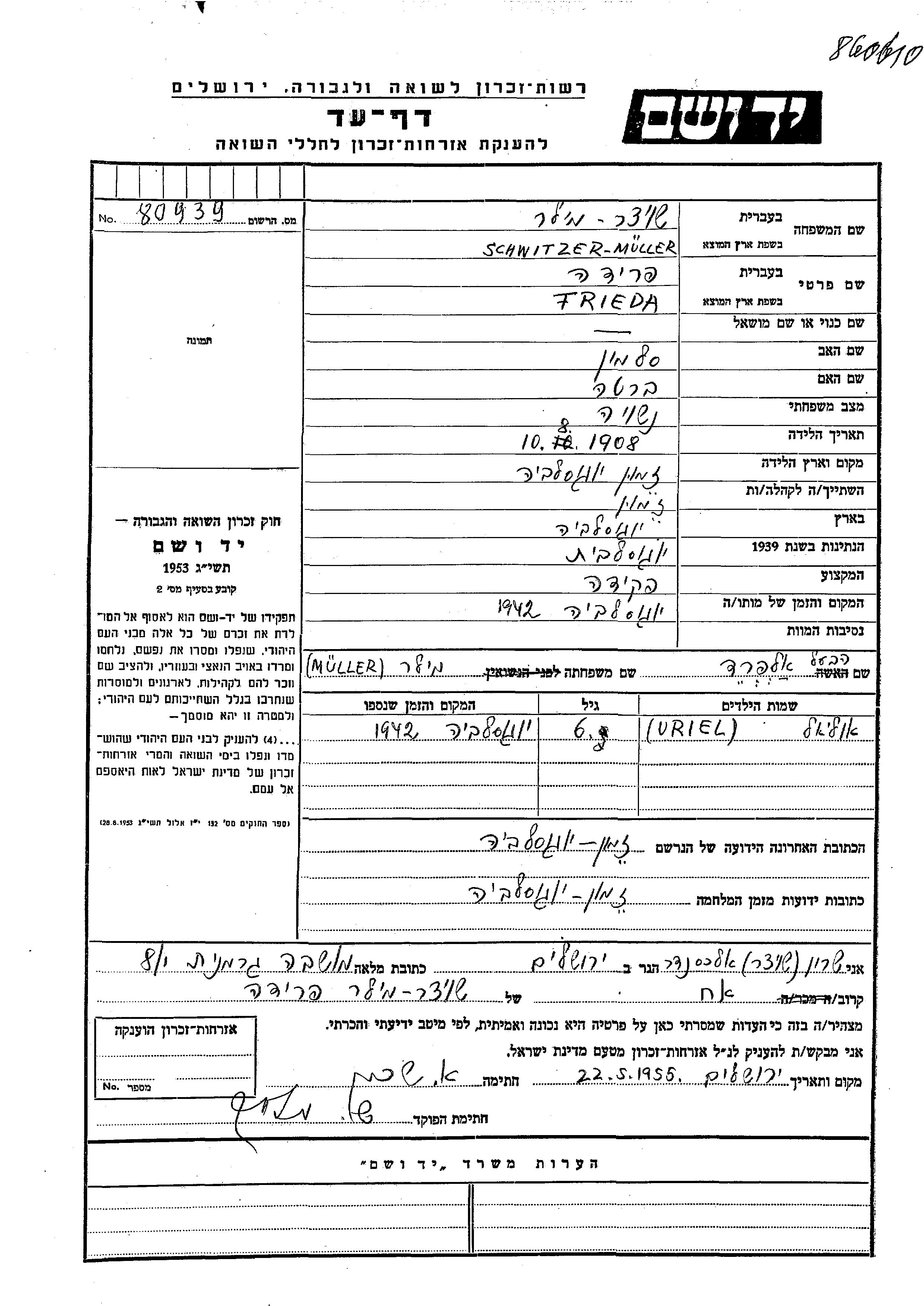 Muller Frieda 1908 Zemun, Yugoslavie Feuille de témoignage