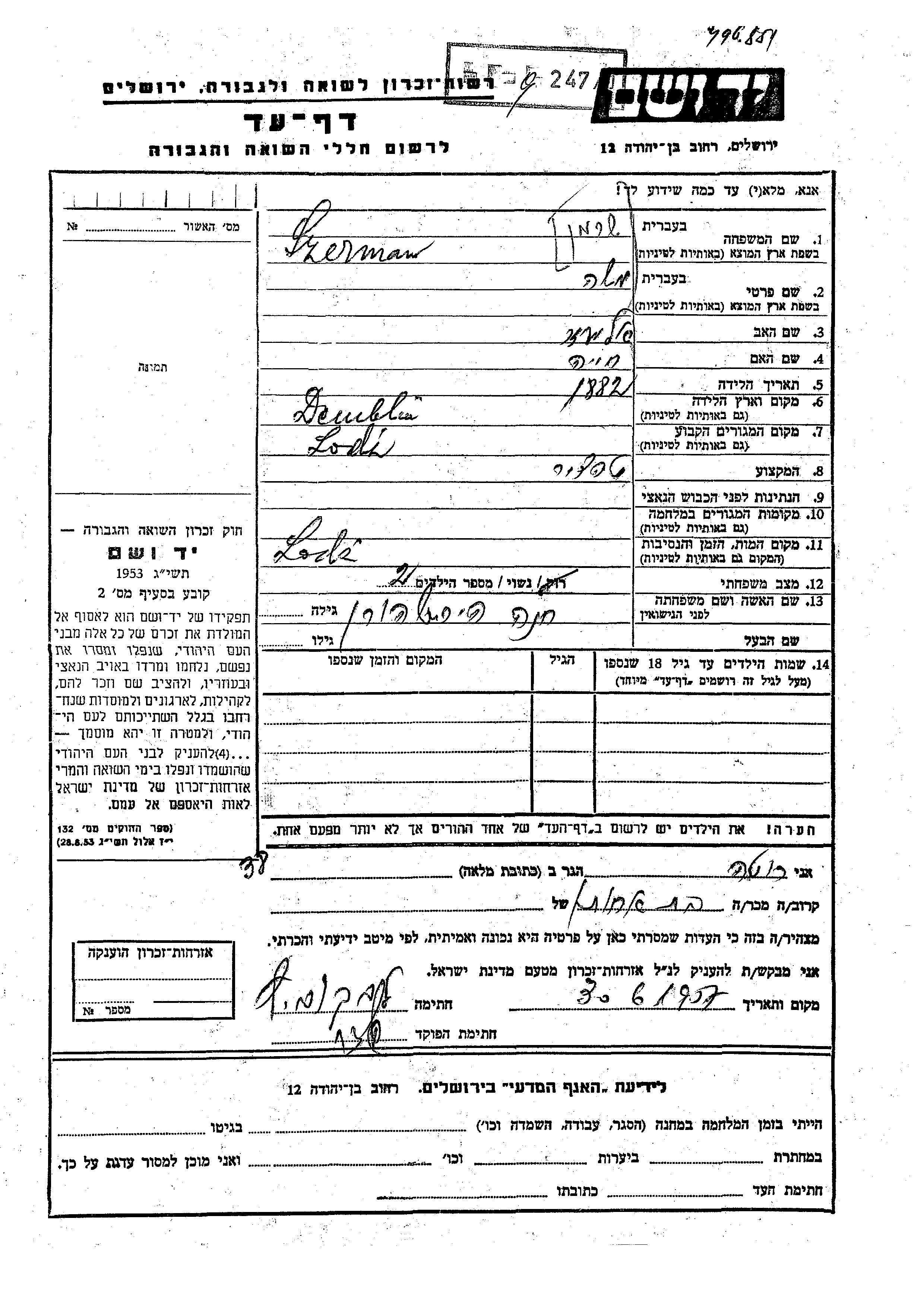 Szerman Moshe 1882 Lodz, Pologne Feuille de témoignage