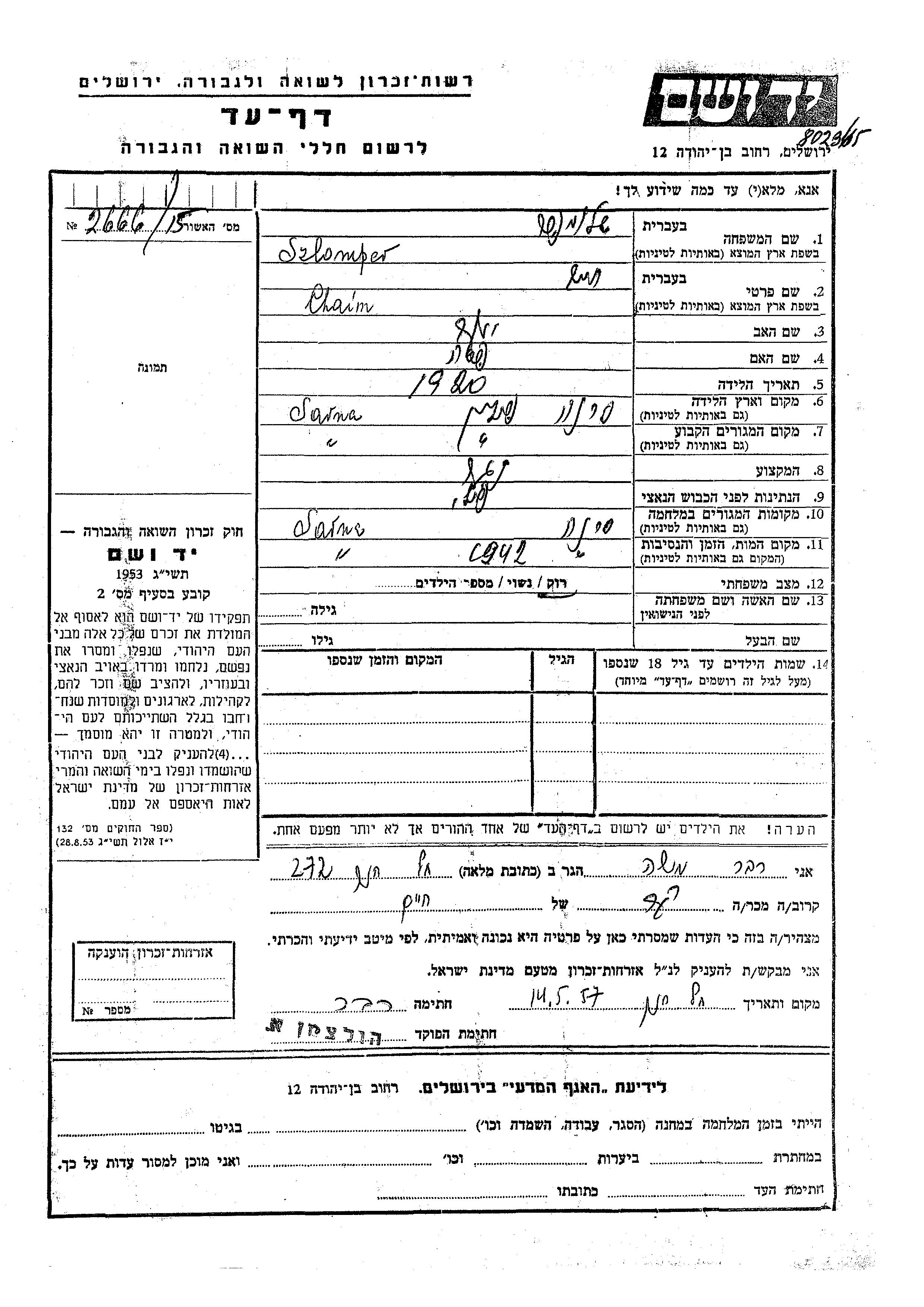 Chaim Szlomper est né à Sarna, Pologne en 1920, fils de Yaakov et de Pesa. Il était Charpentier et Célibataire. Avant la seconde guerre mondiale il vivait à Sarna, Pologne. Au cours de la guerre, il était à Sarna, Pologne.