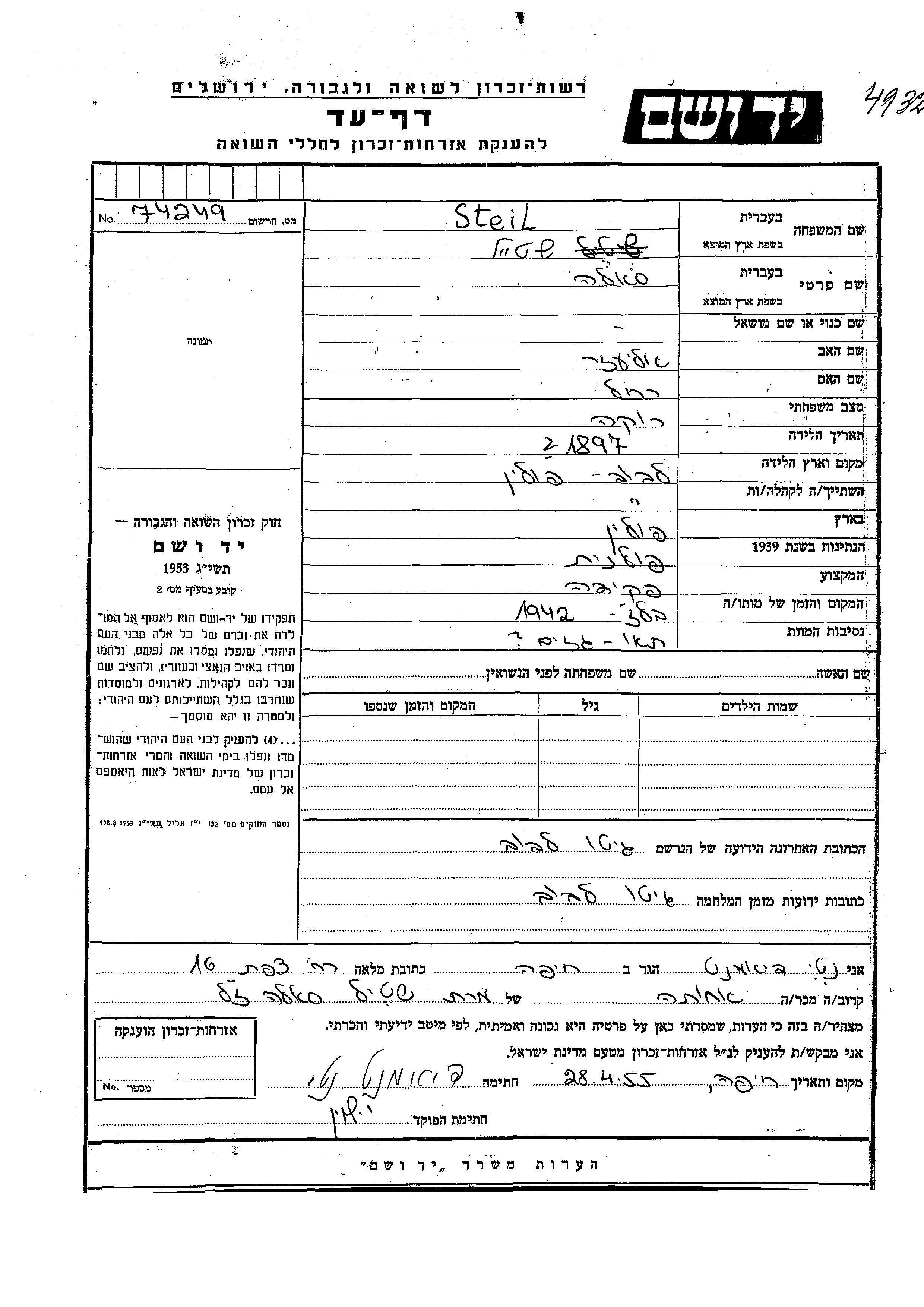 Steil Shulamit 1897 Lwow, Pologne Feuille de témoignage