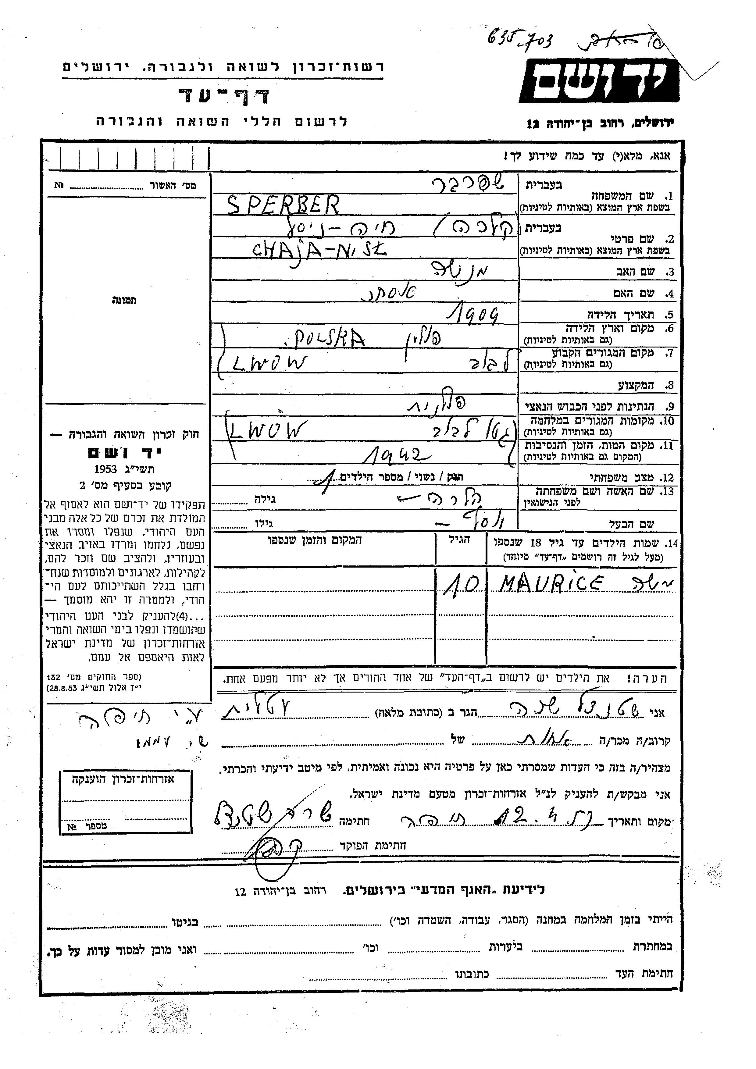 Sperber Chaja Nisel Klara 1909 Lwow, Pologne Feuille de témoignage