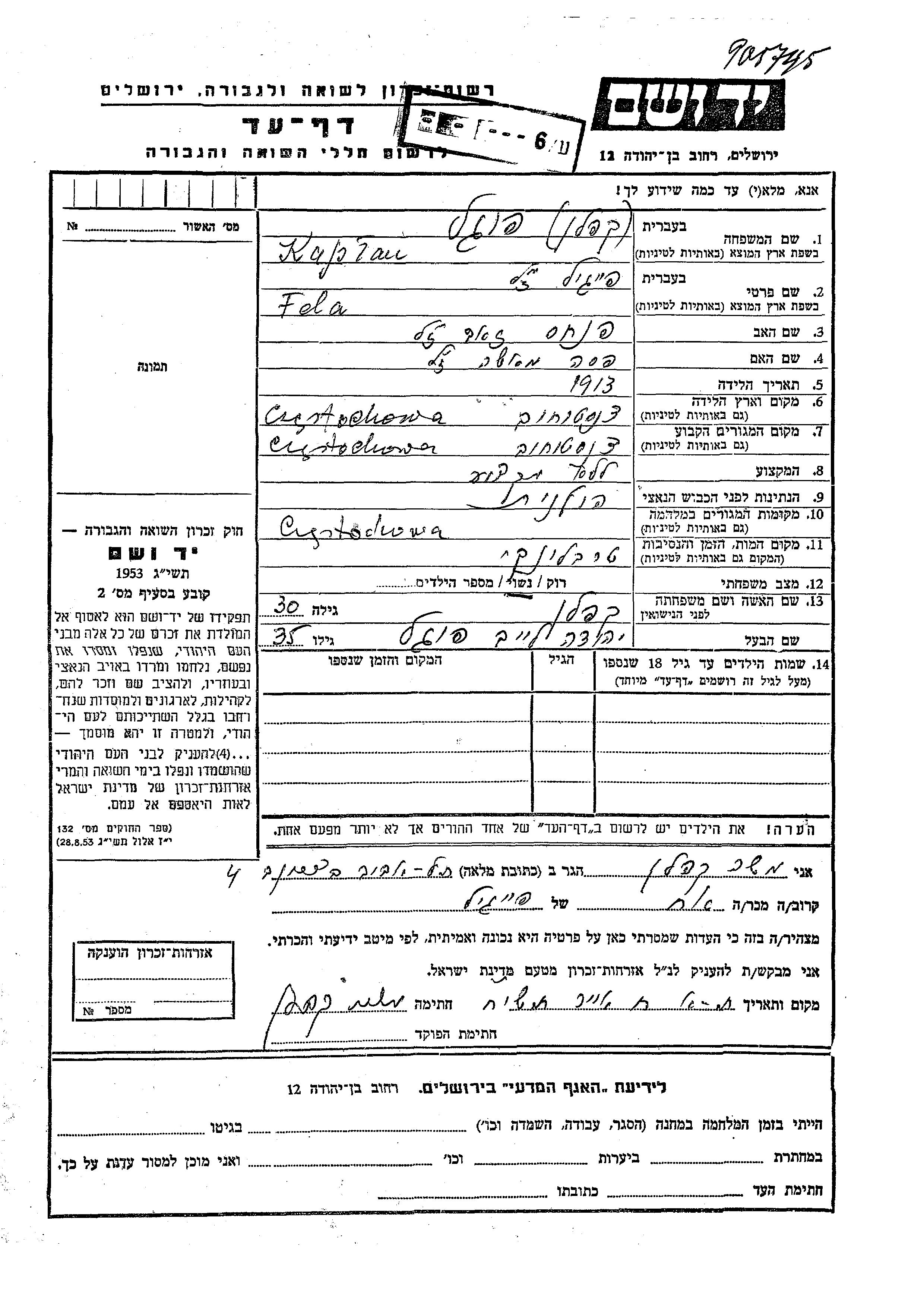 Fogel Fela Feigil 1913 Czestochowa, Pologne Feuille de témoignage