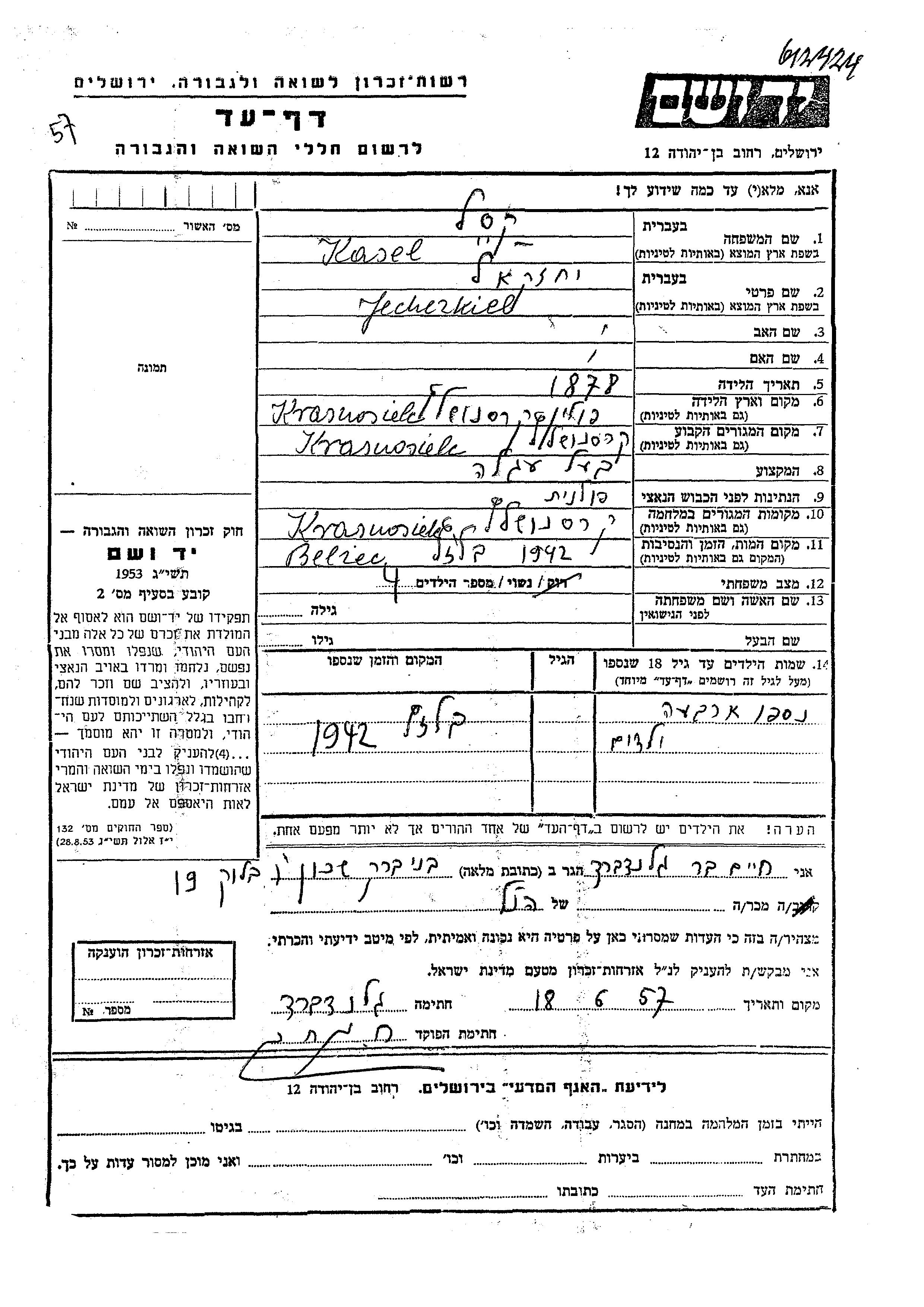 Kasel Jechezkiel 1878 Krasnosielc, Pologne Feuille de témoignage