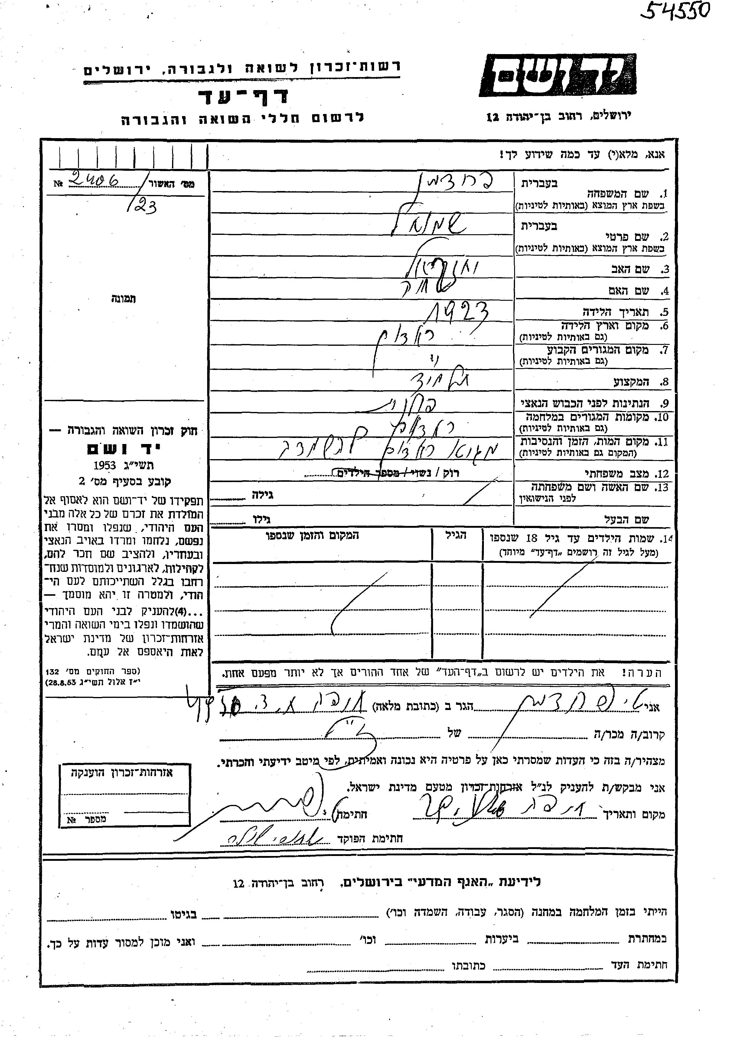 Fridman Shmuel 1923 Radom, Pologne Feuille de témoignage