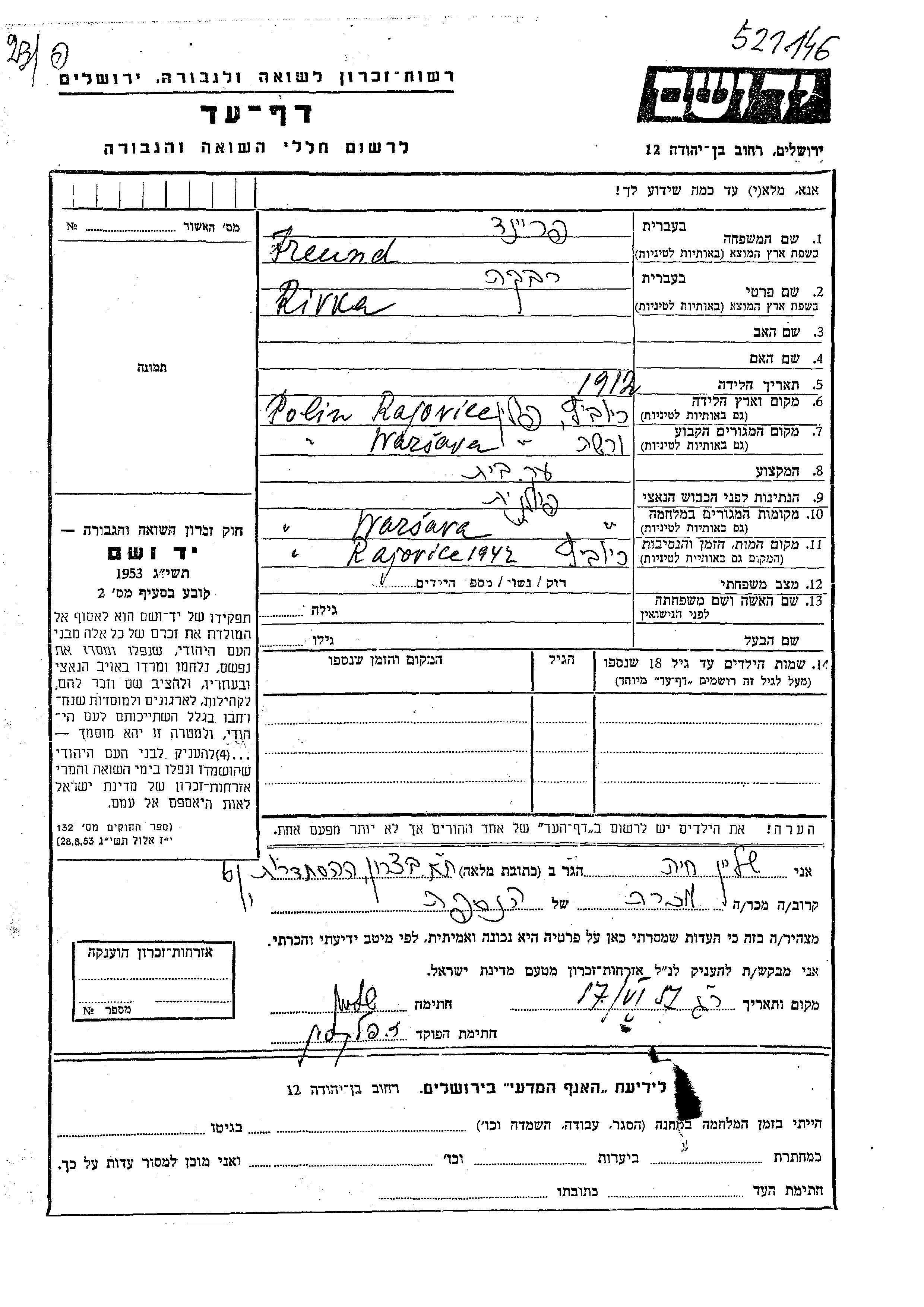 Friend Rivka 1912 Warsaw, Pologne Feuille de témoignage