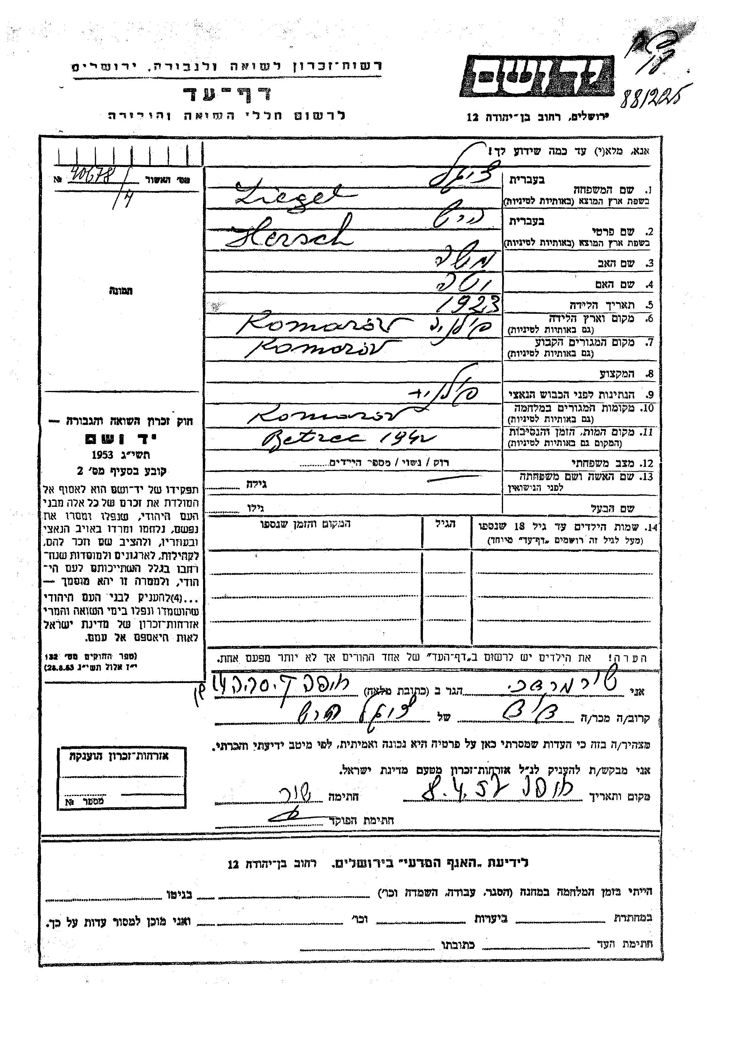 Hersch Ziegel est né à Komarow, Pologne en 1923, fils de Moshe et de Yeta. Il était Célibataire. Avant la seconde guerre mondiale il vivait à Komarow, Pologne. Au cours de la guerre, il était à Komarow, Pologne.
