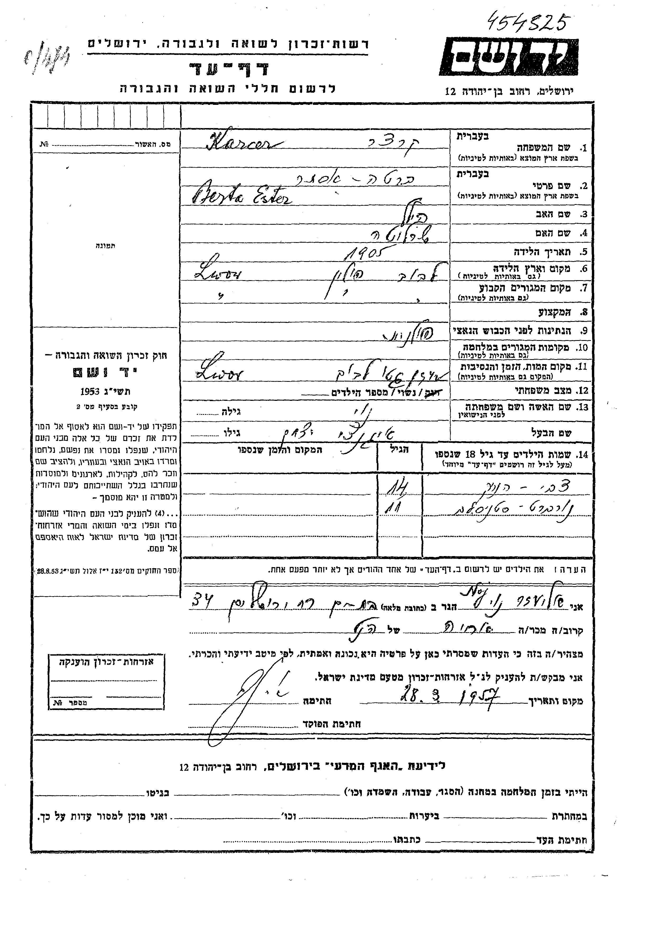 Karcer Berta Ester 1905 Lwow, Pologne Feuille de témoignage