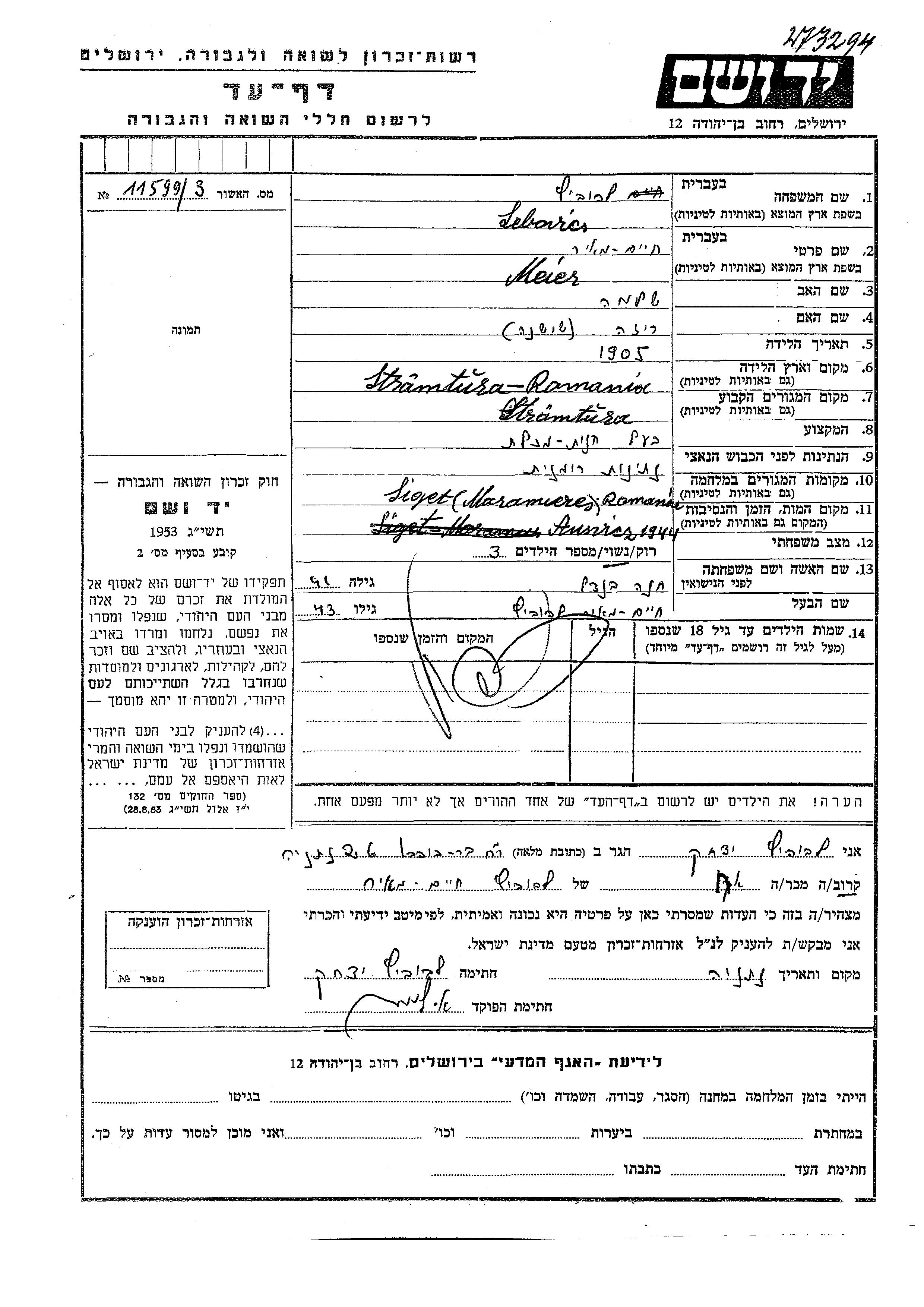 Lebovic Meir Khaim 1905 Stramtura, Roumanie Feuille de témoignage
