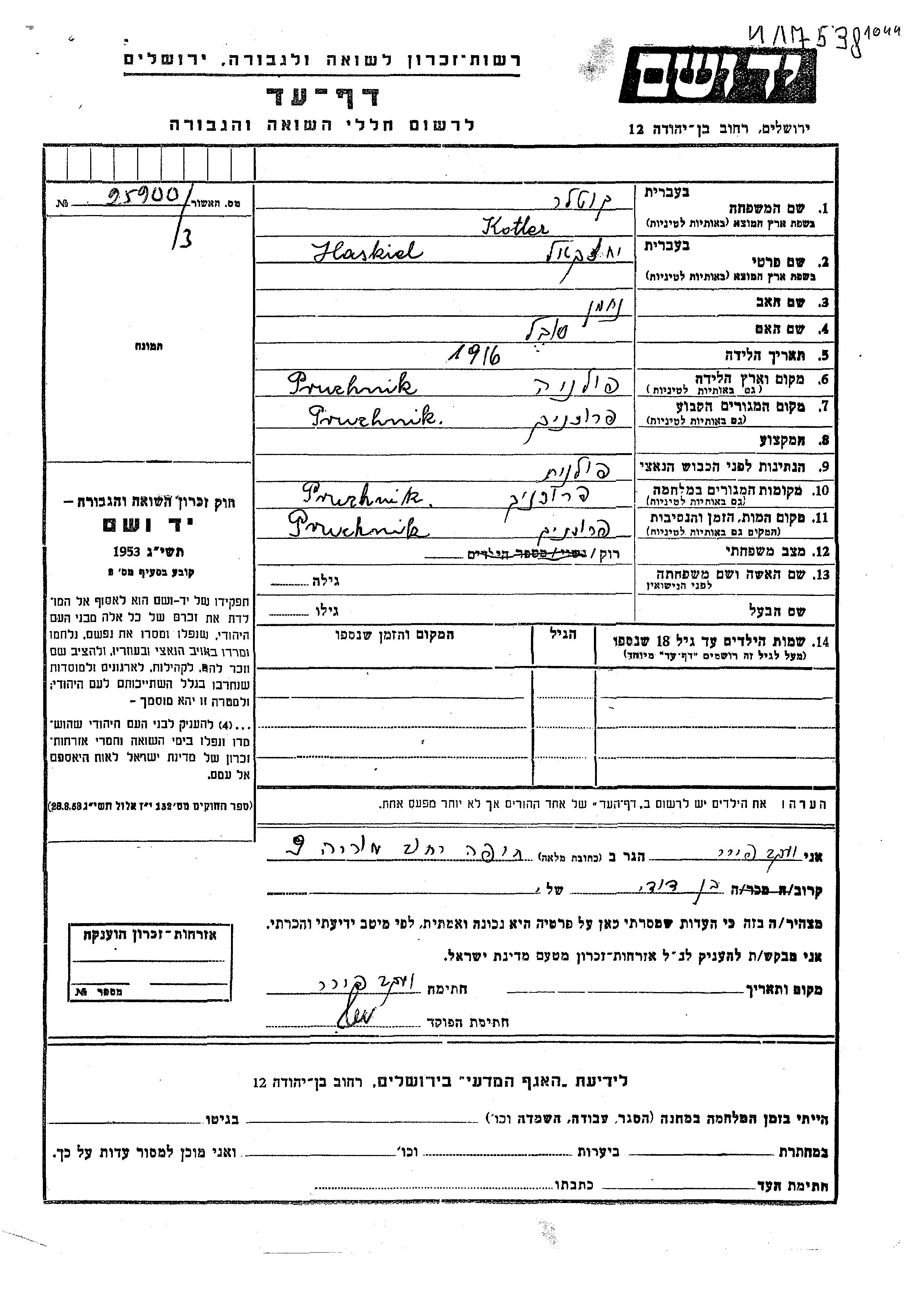 Kotliar Jaske Yekhezkel 1916 Pruchnik, Pologne Feuille de témoignage