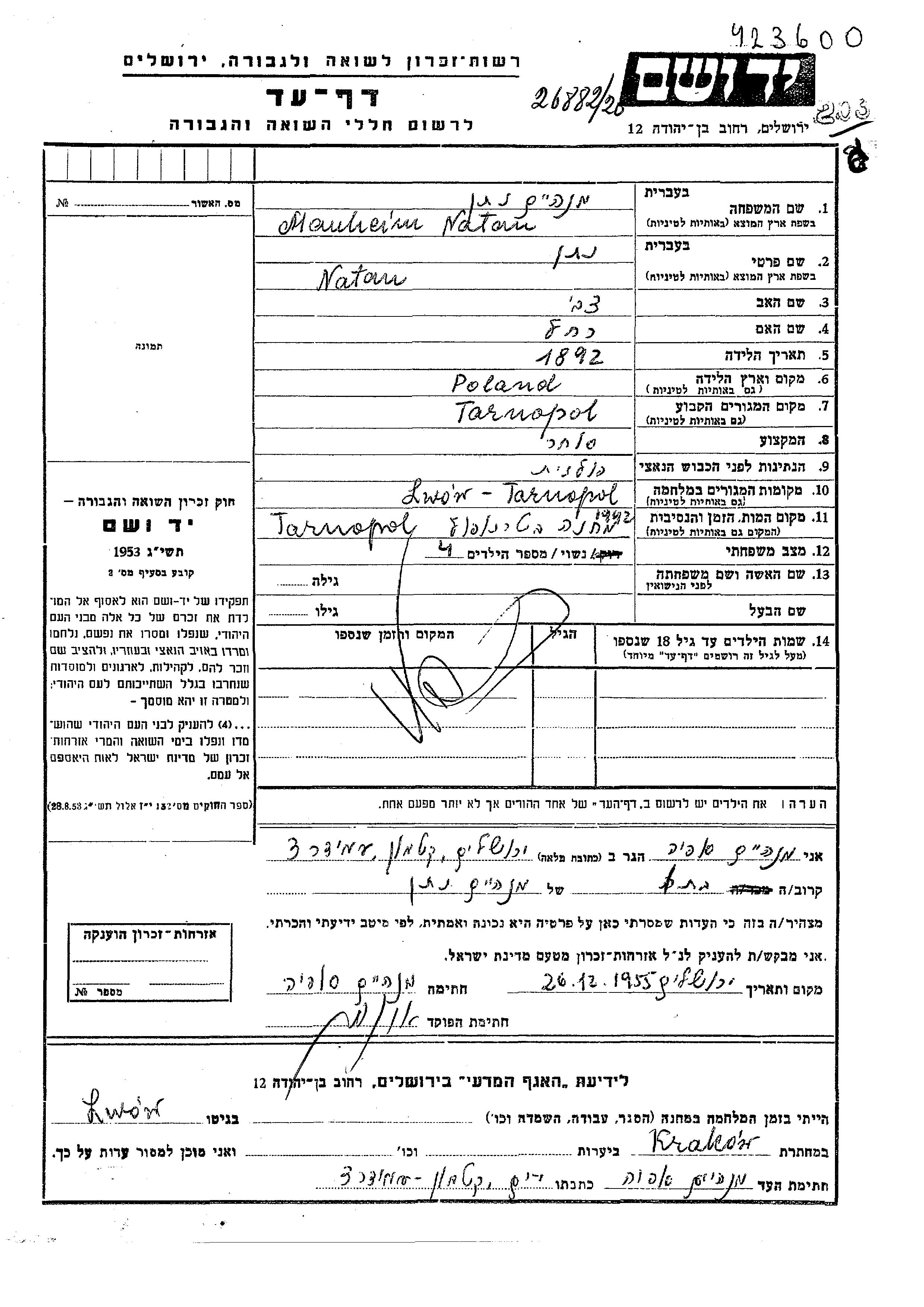 Natan a été assassiné pendant la Shoah. Lieu de la mort: Tarnopol, Pologne en 1942.