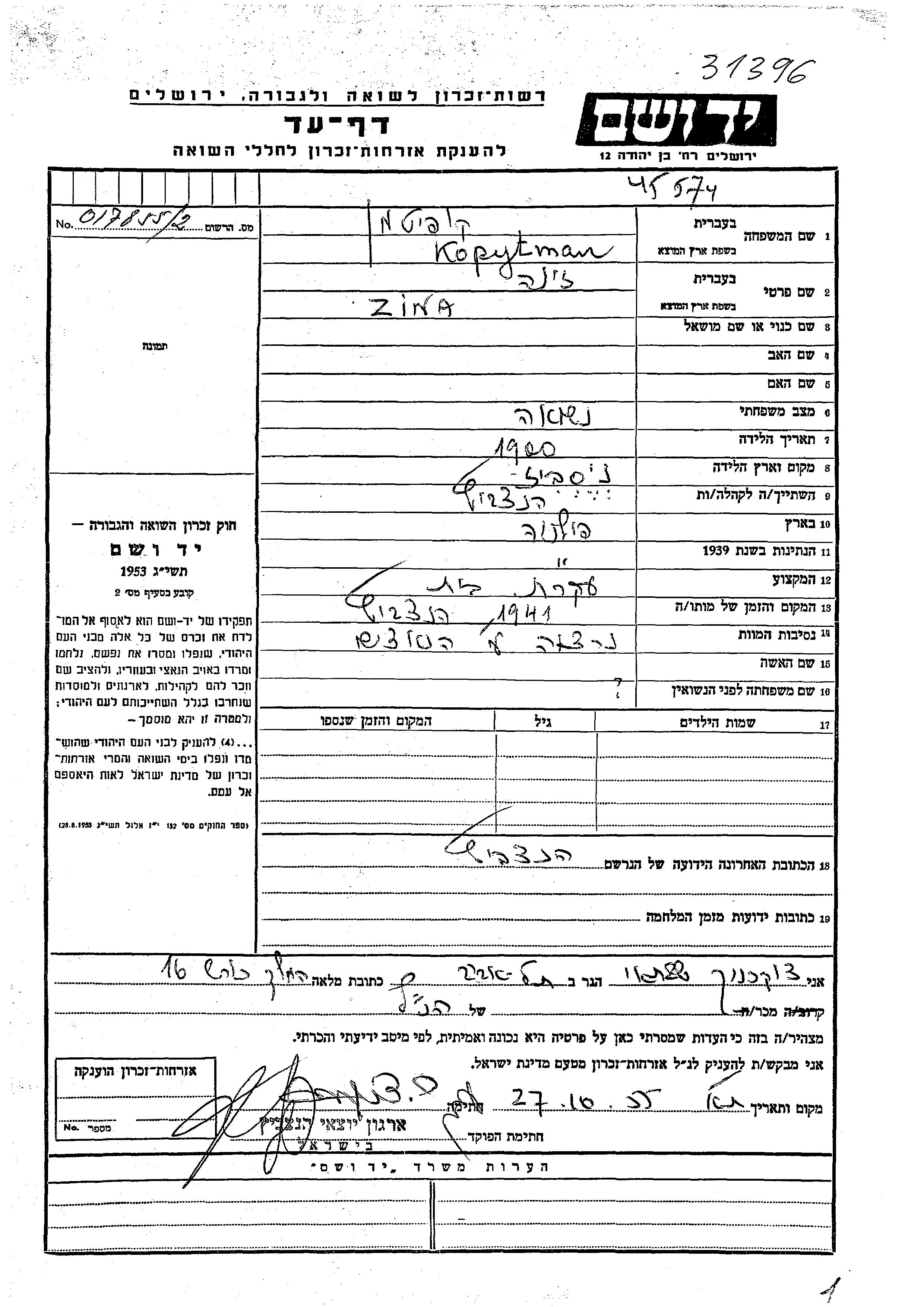Kopytman Zina 1920 endroit inconnu, Feuille de témoignage