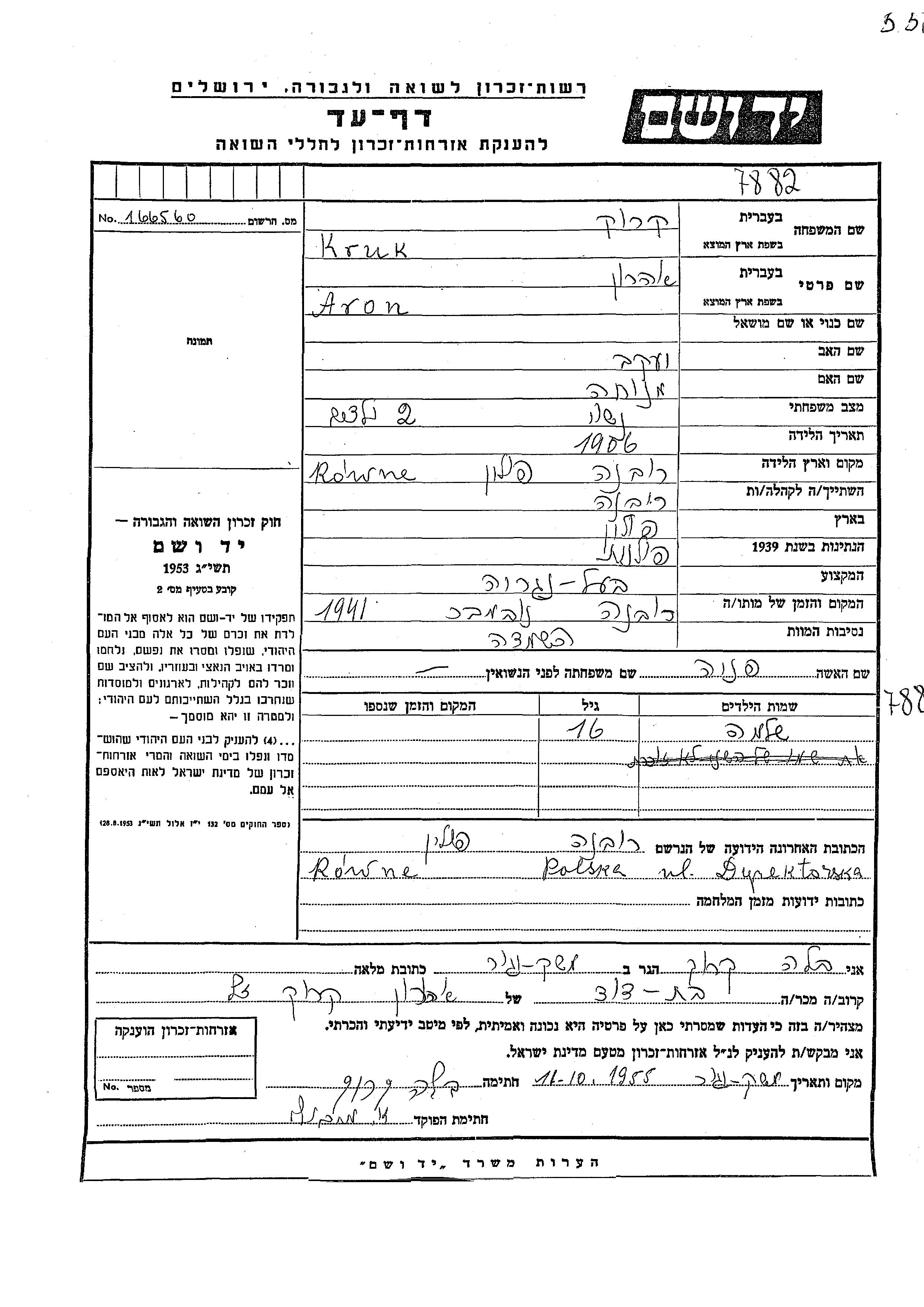 Kruk Aron 1906 endroit inconnu, Feuille de témoignage